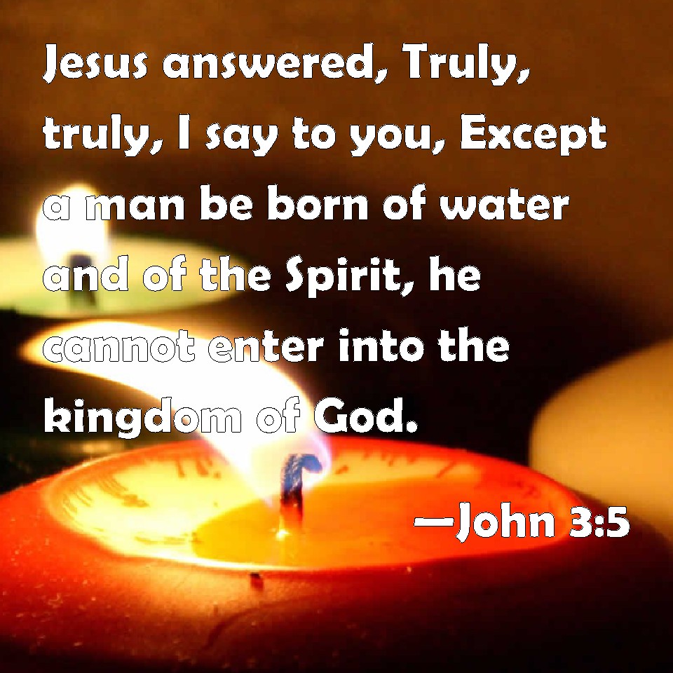 Choose a Background John 3:5 Jesus answered, Truly, truly, I say to you, Except a man be born of water and of the Spirit, he cannot enter into the kingdom of God. KJV: Jesus answered, Verily, verily, I say unto thee, Except a man be born of water and of the Spirit, he cannot enter into the kingdom of God. DRB: Jesus answered: Amen, amen I say to thee, unless a man be born again of water and the Holy Ghost, he cannot enter into the kingdom of God. DBT: Jesus answered, Verily, verily, I say unto thee, Except any one be born of water and of Spirit, he cannot enter into the kingdom of God. ERV: Jesus answered, Verily, verily, I say unto thee, Except a man be born of water and the Spirit, he cannot enter into the kingdom of God. WBT: Jesus answered, Verily, verily, I say to thee, Except a man be born of water, and of the Spirit, he cannot enter into the kingdom of God. WEB: Jesus answered, "Most certainly I tell you, unless one is born of water and spirit, he can't enter into the Kingdom of God! YLT: Jesus answered, 'Verily, verily, I say to thee, If any one may not be born of water, and the Spirit, he is not able to enter into the reign of God;Links John 3:5 NIV • John 3:5 NLT • John 3:5 ESV • John 3:5 NASB • John 3:5 KJV • John 3:5 Interlinear • John 3:5 Commentaries • John 3:5 Parallel Texts • John 3:5 Bible Apps • John 3:5 Parallel • Bible Hub |