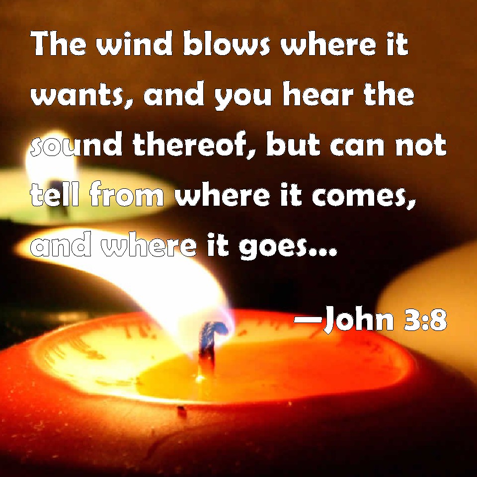 Choose a Background John 3:8 The wind blows where it wants, and you hear the sound thereof, but can not tell from where it comes, and where it goes: so is every one that is born of the Spirit. KJV: The wind bloweth where it listeth, and thou hearest the sound thereof, but canst not tell whence it cometh, and whither it goeth: so is every one that is born of the Spirit. DRB: The Spirit breatheth where he will; and thou hearest his voice, but thou knowest not whence he cometh, and whither he goeth: so is every one that is born of the Spirit. DBT: The wind blows where it will, and thou hearest its voice, but knowest not whence it comes and where it goes: thus is every one that is born of the Spirit. ERV: The wind bloweth where it listeth, and thou hearest the voice thereof, but knowest not whence it cometh, and whither it goeth: so is every one that is born of the Spirit. WBT: The wind bloweth where it will, and thou hearest the sound of it, but canst not tell whence it cometh, and whither it goeth: so is every one that is born of the Spirit. WEB: The wind blows where it wants to, and you hear its sound, but don't know where it comes from and where it is going. So is everyone who is born of the Spirit." YLT: the Spirit where he willeth doth blow, and his voice thou dost hear, but thou hast not known whence he cometh, and whither he goeth; thus is every one who hath been born of the Spirit.'Links John 3:8 NIV • John 3:8 NLT • John 3:8 ESV • John 3:8 NASB • John 3:8 KJV • John 3:8 Interlinear • John 3:8 Commentaries • John 3:8 Parallel Texts • John 3:8 Bible Apps • John 3:8 Parallel • Bible Hub |