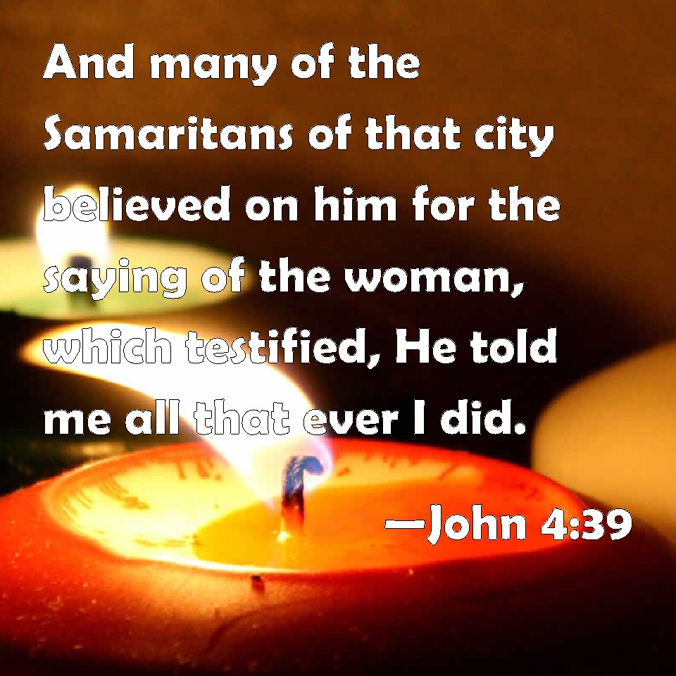 Choose a Background John 4:39 And many of the Samaritans of that city believed on him for the saying of the woman, which testified, He told me all that ever I did. KJV: And many of the Samaritans of that city believed on him for the saying of the woman, which testified, He told me all that ever I did. DRB: Now of that city many of the Samaritans believed in him, for the word of the woman giving testimony: He told me all things whatsoever I have done. DBT: But many of the Samaritans of that city believed on him because of the word of the woman who bore witness, He told me all things that I had ever done. ERV: And from that city many of the Samaritans believed on him because of the word of the woman, who testified, He told me all things that ever I did. WBT: And many of the Samaritans of that city believed on him for the saying of the woman, who testified, He told me all that ever I did. WEB: From that city many of the Samaritans believed in him because of the word of the woman, who testified, "He told me everything that I did." YLT: And from that city many believed in him, of the Samaritans, because of the word of the woman testifying, — 'He told me all things — as many as I did.'Links John 4:39 NIV • John 4:39 NLT • John 4:39 ESV • John 4:39 NASB • John 4:39 KJV • John 4:39 Interlinear • John 4:39 Commentaries • John 4:39 Parallel Texts • John 4:39 Bible Apps • John 4:39 Parallel • Bible Hub |