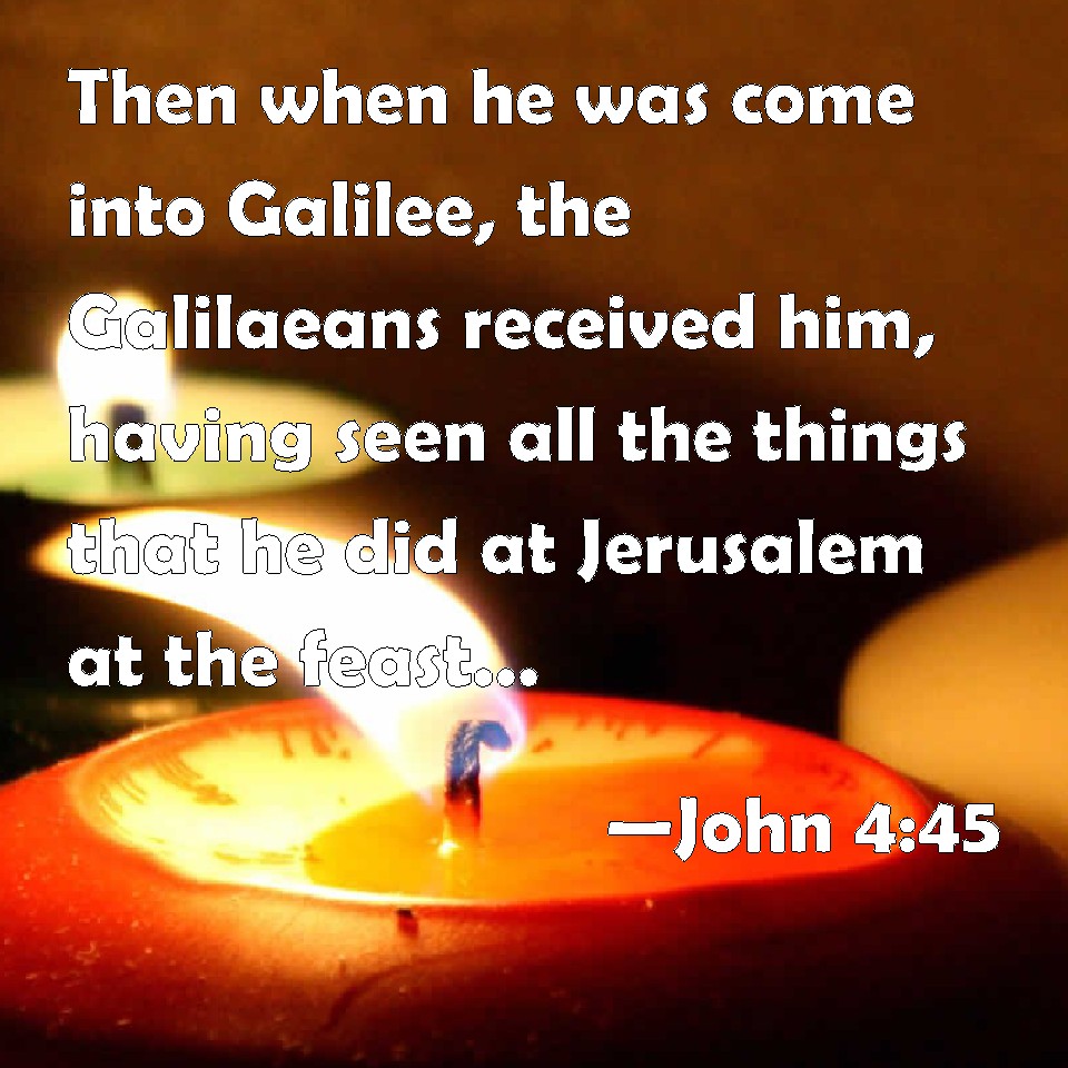Choose a Background John 4:45 Then when he was come into Galilee, the Galilaeans received him, having seen all the things that he did at Jerusalem at the feast: for they also went to the feast. KJV: Then when he was come into Galilee, the Galilaeans received him, having seen all the things that he did at Jerusalem at the feast: for they also went unto the feast. DRB: And when he was come into Galilee, the Galileans received him, having seen all the things he had done at Jerusalem on the festival day; for they also went to the festival day. DBT: When therefore he came into Galilee, the Galileans received him, having seen all that he had done in Jerusalem during the feast, for they also went to the feast. ERV: So when he came into Galilee, the Galilaeans received him, having seen all the things that he did in Jerusalem at the feast: for they also went unto the feast. WBT: Then when he had come into Galilee, the Galileans received him, having seen all the things that he did at Jerusalem at the feast: for they also went to the feast. WEB: So when he came into Galilee, the Galileans received him, having seen all the things that he did in Jerusalem at the feast, for they also went to the feast. YLT: when then, he came to Galilee, the Galileans received him, having seen all things that he did in Jerusalem in the feast — for they also went to the feast.Links John 4:45 NIV • John 4:45 NLT • John 4:45 ESV • John 4:45 NASB • John 4:45 KJV • John 4:45 Interlinear • John 4:45 Commentaries • John 4:45 Parallel Texts • John 4:45 Bible Apps • John 4:45 Parallel • Bible Hub |
