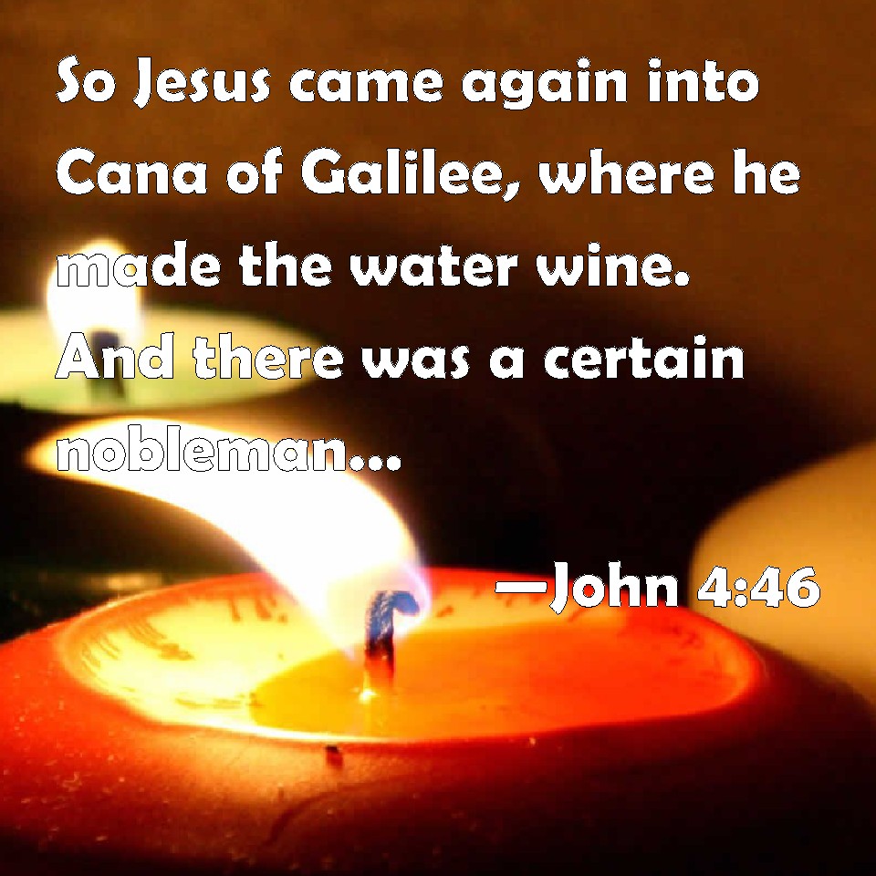 Choose a Background John 4:46 So Jesus came again into Cana of Galilee, where he made the water wine. And there was a certain nobleman, whose son was sick at Capernaum. KJV: So Jesus came again into Cana of Galilee, where he made the water wine. And there was a certain nobleman, whose son was sick at Capernaum. DRB: He came again therefore into Cana of Galilee, where he made the water wine. And there was a certain ruler, whose son was sick at Capharnaum. DBT: He came therefore again to Cana of Galilee, where he made the water wine. And there was a certain courtier in Capernaum whose son was sick. ERV: He came therefore again unto Cana of Galilee, where he made the water wine. And there was a certain nobleman, whose son was sick at Capernaum. WBT: So Jesus came again into Cana of Galilee, where he made the water wine. And there was a certain nobleman, whose son was sick at Capernaum. WEB: Jesus came therefore again to Cana of Galilee, where he made the water into wine. There was a certain nobleman whose son was sick at Capernaum. YLT: Jesus came, therefore, again to Cana of Galilee, where he made the water wine, and there was a certain courtier, whose son was ailing in Capernaum,Links John 4:46 NIV • John 4:46 NLT • John 4:46 ESV • John 4:46 NASB • John 4:46 KJV • John 4:46 Interlinear • John 4:46 Commentaries • John 4:46 Parallel Texts • John 4:46 Bible Apps • John 4:46 Parallel • Bible Hub |