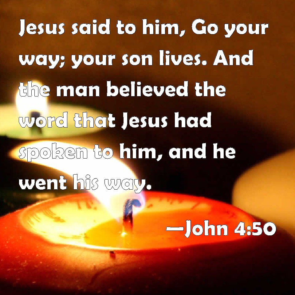 Choose a Background John 4:50 Jesus said to him, Go your way; your son lives. And the man believed the word that Jesus had spoken to him, and he went his way. KJV: Jesus saith unto him, Go thy way; thy son liveth. And the man believed the word that Jesus had spoken unto him, and he went his way. DRB: Jesus saith to him: Go thy way; thy son liveth. The man believed the word which Jesus said to him, and went his way. DBT: Jesus says to him, Go, thy son lives. And the man believed the word which Jesus said to him, and went his way. ERV: Jesus saith unto him, Go thy way; thy son liveth. The man believed the word that Jesus spake unto him, and he went his way. WBT: Jesus saith to him, Go; thy son liveth. And the man believed the word that Jesus had spoken to him, and he departed. WEB: Jesus said to him, "Go your way. Your son lives." The man believed the word that Jesus spoke to him, and he went his way. YLT: Jesus saith to him, 'Be going on; thy son doth live.' And the man believed the word that Jesus said to him, and was going on,Links John 4:50 NIV • John 4:50 NLT • John 4:50 ESV • John 4:50 NASB • John 4:50 KJV • John 4:50 Interlinear • John 4:50 Commentaries • John 4:50 Parallel Texts • John 4:50 Bible Apps • John 4:50 Parallel • Bible Hub |