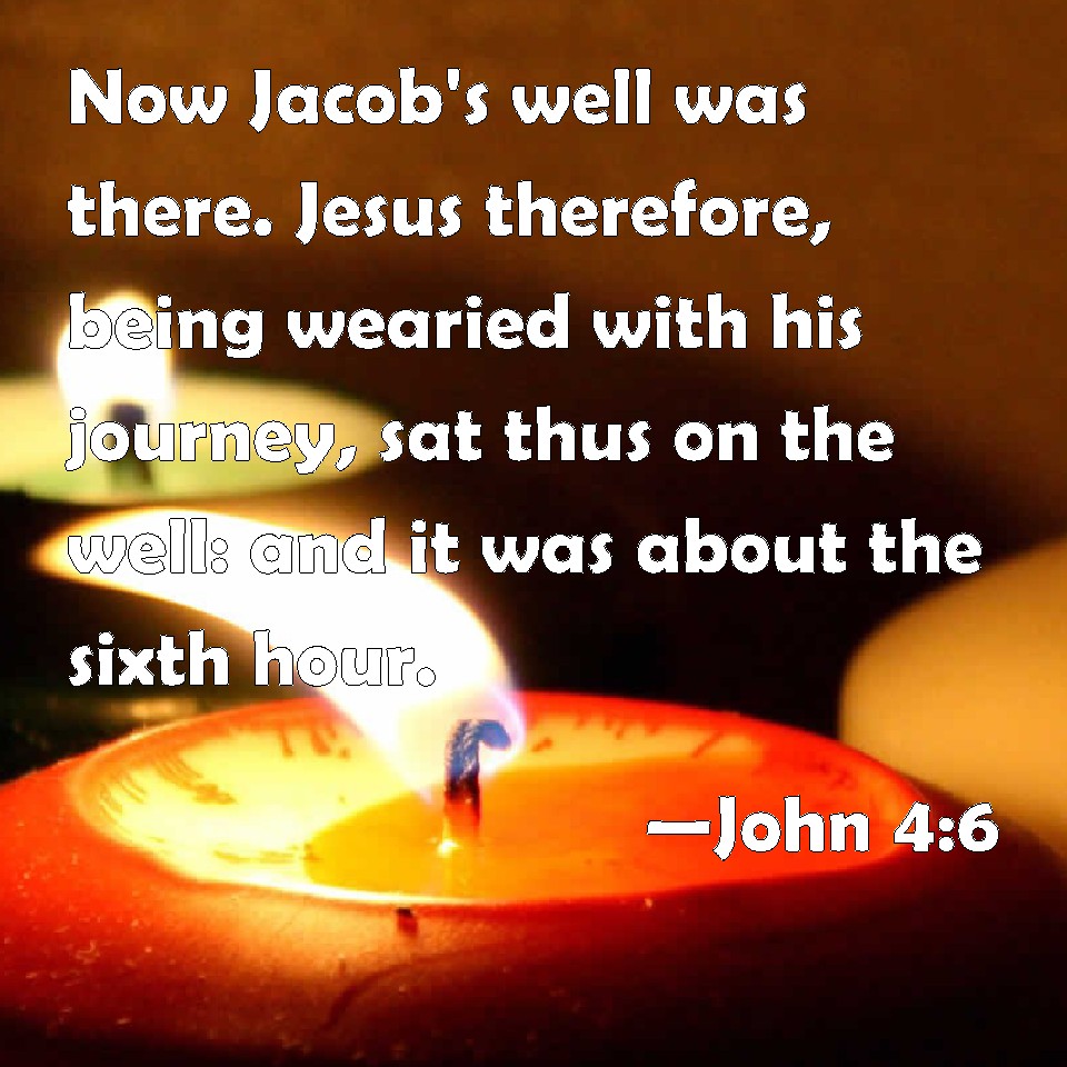 Choose a Background John 4:6 Now Jacob's well was there. Jesus therefore, being wearied with his journey, sat thus on the well: and it was about the sixth hour. KJV: Now Jacob's well was there. Jesus therefore, being wearied with his journey, sat thus on the well: and it was about the sixth hour. DRB: Now Jacob's well was there. Jesus therefore being wearied with his journey, sat thus on the well. It was about the sixth hour. DBT: Now a fountain of Jacob's was there; Jesus therefore, being wearied with the way he had come, sat just as he was at the fountain. It was about the sixth hour. ERV: and Jacob's well was there. Jesus therefore, being wearied with his journey, sat thus by the well. It was about the sixth hour. WBT: Now Jacob's well was there. Jesus therefore being wearied with his journey, sat thus on the well: and it was about the sixth hour. WEB: Jacob's well was there. Jesus therefore, being tired from his journey, sat down by the well. It was about the sixth hour. YLT: and there was there a well of Jacob. Jesus therefore having been weary from the journeying, was sitting thus on the well; it was as it were the sixth hour;Links John 4:6 NIV • John 4:6 NLT • John 4:6 ESV • John 4:6 NASB • John 4:6 KJV • John 4:6 Interlinear • John 4:6 Commentaries • John 4:6 Parallel Texts • John 4:6 Bible Apps • John 4:6 Parallel • Bible Hub |