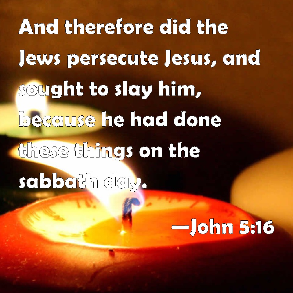 Choose a Background John 5:16 And therefore did the Jews persecute Jesus, and sought to slay him, because he had done these things on the sabbath day. KJV: And therefore did the Jews persecute Jesus, and sought to slay him, because he had done these things on the sabbath day. DRB: Therefore did the Jews persecute Jesus, because he did these things on the sabbath. DBT: And for this the Jews persecuted Jesus and sought to kill him, because he had done these things on sabbath. ERV: And for this cause did the Jews persecute Jesus, because he did these things on the sabbath. WBT: And therefore the Jews persecuted Jesus, and sought to slay him, because he had done these things on the sabbath. WEB: For this cause the Jews persecuted Jesus, and sought to kill him, because he did these things on the Sabbath. YLT: and because of this were the Jews persecuting Jesus, and seeking to kill him, because these things he was doing on a sabbath.Links John 5:16 NIV • John 5:16 NLT • John 5:16 ESV • John 5:16 NASB • John 5:16 KJV • John 5:16 Interlinear • John 5:16 Commentaries • John 5:16 Parallel Texts • John 5:16 Bible Apps • John 5:16 Parallel • Bible Hub |