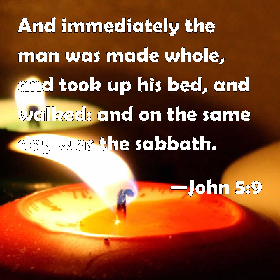 Choose a Background John 5:9 And immediately the man was made whole, and took up his bed, and walked: and on the same day was the sabbath. KJV: And immediately the man was made whole, and took up his bed, and walked: and on the same day was the sabbath. DRB: And immediately the man was made whole: and he took up his bed, and walked. And it was the sabbath that day. DBT: And immediately the man became well, and took up his couch and walked: and on that day was sabbath. ERV: And straightway the man was made whole, and took up his bed and walked. Now it was the sabbath on that day. WBT: And immediately the man was healed, and took up his bed, and walked: and on the same day was the sabbath. WEB: Immediately, the man was made well, and took up his mat and walked. Now it was the Sabbath on that day. YLT: and immediately the man became whole, and he took up his couch, and was walking, and it was a sabbath on that day,Links John 5:9 NIV • John 5:9 NLT • John 5:9 ESV • John 5:9 NASB • John 5:9 KJV • John 5:9 Interlinear • John 5:9 Commentaries • John 5:9 Parallel Texts • John 5:9 Bible Apps • John 5:9 Parallel • Bible Hub |