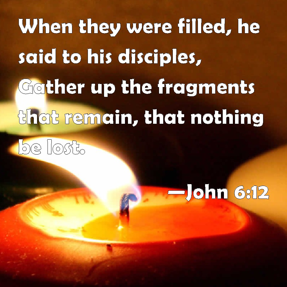 Choose a Background John 6:12 When they were filled, he said to his disciples, Gather up the fragments that remain, that nothing be lost. KJV: When they were filled, he said unto his disciples, Gather up the fragments that remain, that nothing be lost. DRB: And when they were filled, he said to his disciples: Gather up the fragments that remain, lest they be lost. DBT: And when they had been filled, he says to his disciples, Gather together the fragments which are over and above, that nothing may be lost. ERV: And when they were filled, he saith unto his disciples, Gather up the broken pieces which remain over, that nothing be lost. WBT: When they were satisfied, he said to his disciples, Gather the fragments that remain, that nothing may be lost. WEB: When they were filled, he said to his disciples, "Gather up the broken pieces which are left over, that nothing be lost." YLT: And when they were filled, he saith to his disciples, 'Gather together the broken pieces that are over, that nothing may be lost;'Links John 6:12 NIV • John 6:12 NLT • John 6:12 ESV • John 6:12 NASB • John 6:12 KJV • John 6:12 Interlinear • John 6:12 Commentaries • John 6:12 Parallel Texts • John 6:12 Bible Apps • John 6:12 Parallel • Bible Hub |