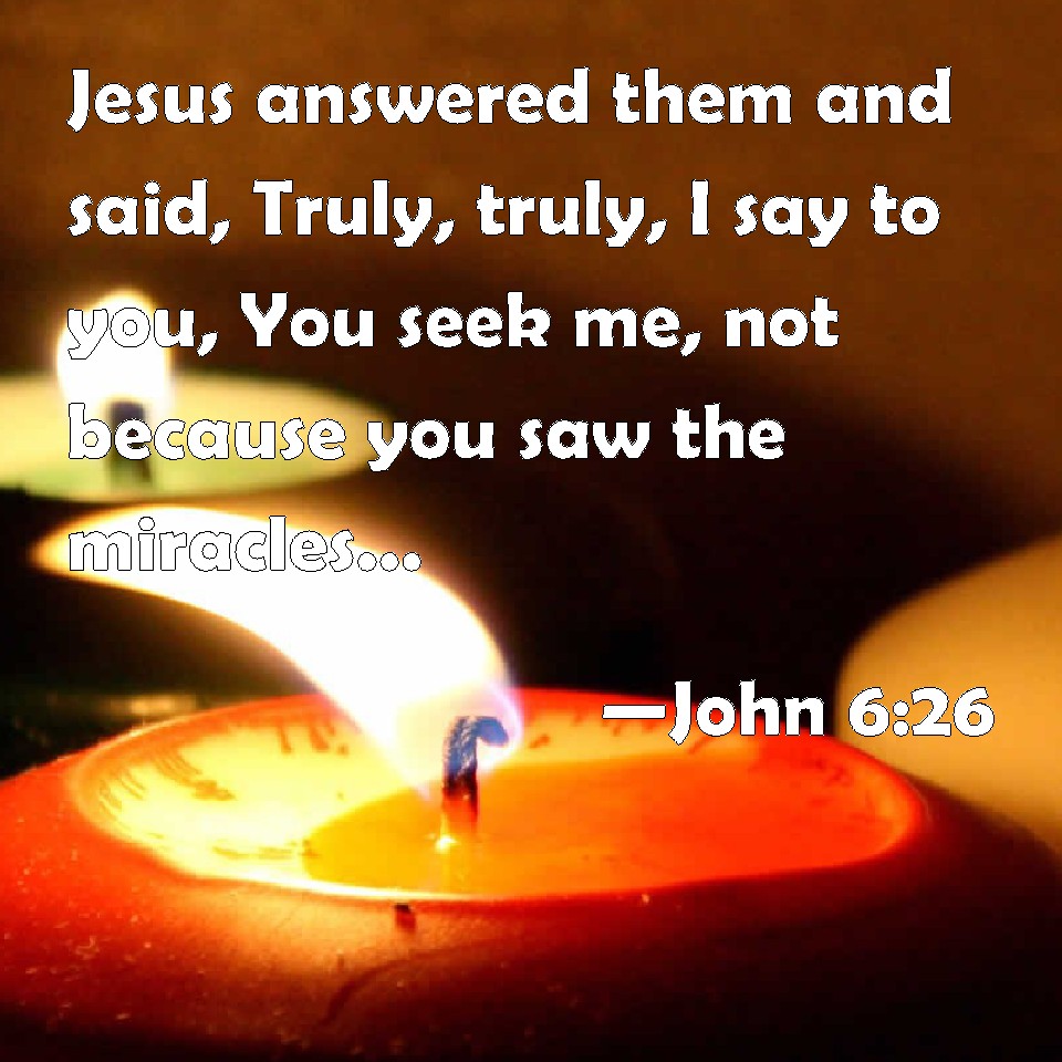 Choose a Background John 6:26 Jesus answered them and said, Truly, truly, I say to you, You seek me, not because you saw the miracles, but because you did eat of the loaves, and were filled. KJV: Jesus answered them and said, Verily, verily, I say unto you, Ye seek me, not because ye saw the miracles, but because ye did eat of the loaves, and were filled. DRB: Jesus answered them, and said: Amen, amen I say to you, you seek me, not because you have seen miracles, but because you did eat of the loaves, and were filled. DBT: Jesus answered them and said, Verily, verily, I say to you, Ye seek me not because ye have seen signs, but because ye have eaten of the loaves and been filled. ERV: Jesus answered them and said, Verily, verily, I say unto you, Ye seek me, not because ye saw signs, but because ye ate of the loaves, and were filled. WBT: Jesus answered them and said, Verily, verily, I say to you, Ye seek me, not because ye saw the miracles, but because ye ate of the loaves, and were satisfied. WEB: Jesus answered them, "Most certainly I tell you, you seek me, not because you saw signs, but because you ate of the loaves, and were filled. YLT: Jesus answered them and said, 'Verily, verily, I say to you, Ye seek me, not because ye saw signs, but because ye did eat of the loaves, and were satisfied;Links John 6:26 NIV • John 6:26 NLT • John 6:26 ESV • John 6:26 NASB • John 6:26 KJV • John 6:26 Interlinear • John 6:26 Commentaries • John 6:26 Parallel Texts • John 6:26 Bible Apps • John 6:26 Parallel • Bible Hub |
