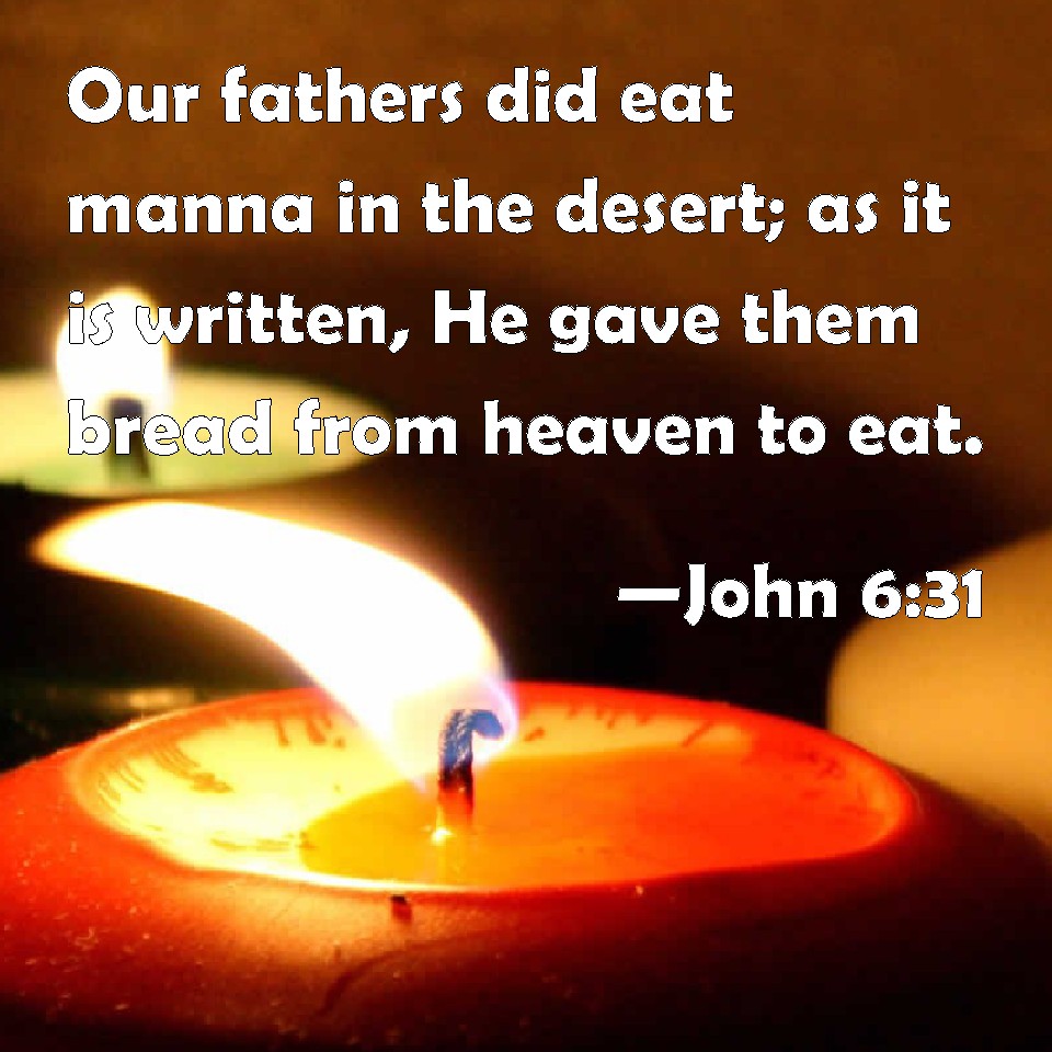 Choose a Background John 6:31 Our fathers did eat manna in the desert; as it is written, He gave them bread from heaven to eat. KJV: Our fathers did eat manna in the desert; as it is written, He gave them bread from heaven to eat. DRB: Our fathers did eat manna in the desert, as it is written: He gave them bread from heaven to eat. DBT: Our fathers ate the manna in the wilderness, as it is written, He gave them bread out of heaven to eat. ERV: Our fathers ate the manna in the wilderness; as it is written, He gave them bread out of heaven to eat. WBT: Our fathers ate manna in the desert; as it is written, He gave them bread from heaven to eat. WEB: Our fathers ate the manna in the wilderness. As it is written, 'He gave them bread out of heaven to eat.'" YLT: our fathers the manna did eat in the wilderness, according as it is having been written, Bread out of the heaven He gave them to eat.'Links John 6:31 NIV • John 6:31 NLT • John 6:31 ESV • John 6:31 NASB • John 6:31 KJV • John 6:31 Interlinear • John 6:31 Commentaries • John 6:31 Parallel Texts • John 6:31 Bible Apps • John 6:31 Parallel • Bible Hub |
