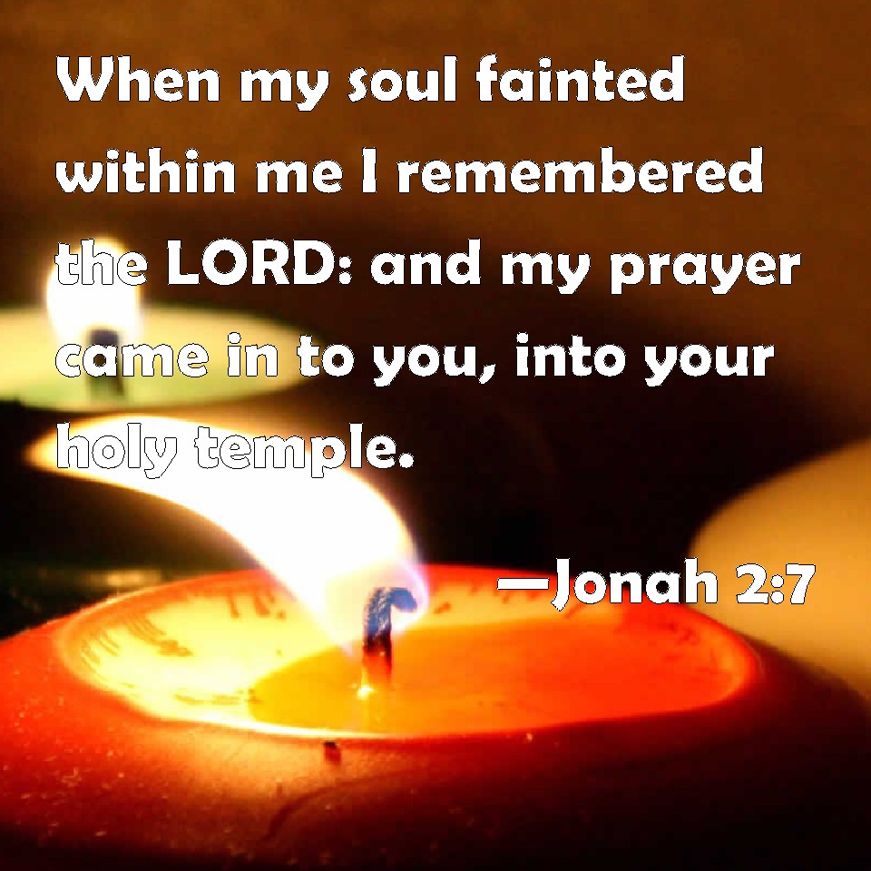 Choose a Background Jonah 2:7 When my soul fainted within me I remembered the LORD: and my prayer came in to you, into your holy temple. KJV: When my soul fainted within me I remembered the LORD: and my prayer came in unto thee, into thine holy temple. DRB: When my soul was in distress within me, I remembered the Lord: that my prayer may come to thee, unto thy holy temple. DBT: When my soul fainted within me, I remembered Jehovah; And my prayer came in unto thee, Into thy holy temple. ERV: When my soul fainted within me, I remembered the LORD: and my prayer came in unto thee, into thine holy temple. WBT: When my soul fainted within me I remembered the LORD: and my prayer came to thee, into thy holy temple. WEB: "When my soul fainted within me, I remembered Yahweh. My prayer came in to you, into your holy temple. YLT: In the feebleness within me of my soul Jehovah I have remembered, And come in unto Thee doth my prayer, Unto Thy holy temple.Links Jonah 2:7 NIV • Jonah 2:7 NLT • Jonah 2:7 ESV • Jonah 2:7 NASB • Jonah 2:7 KJV • Jonah 2:7 Interlinear • Jonah 2:7 Commentaries • Jonah 2:7 Parallel Texts • Jonah 2:7 Bible Apps • Jonah 2:7 Parallel • Bible Hub |