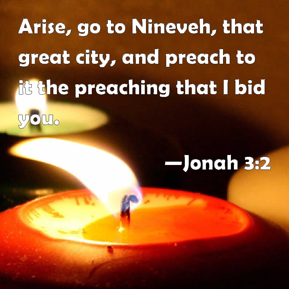 Choose a Background Jonah 3:2 Arise, go to Nineveh, that great city, and preach to it the preaching that I bid you. KJV: Arise, go unto Nineveh, that great city, and preach unto it the preaching that I bid thee. DRB: Arise, and go to Ninive the great city: and preach in it the preaching that I bid thee. DBT: Arise, go to Nineveh, the great city, and preach unto it the preaching that I shall bid thee. ERV: Arise, go unto Nineveh, that great city, and preach unto it the preaching that I bid thee. WBT: Arise, go to Nineveh, that great city, and preach to it the preaching that I bid thee. WEB: "Arise, go to Nineveh, that great city, and preach to it the message that I give you." YLT: 'Rise, go unto Nineveh, the great city, and proclaim unto it the proclamation that I am speaking unto thee;'Links Jonah 3:2 NIV • Jonah 3:2 NLT • Jonah 3:2 ESV • Jonah 3:2 NASB • Jonah 3:2 KJV • Jonah 3:2 Interlinear • Jonah 3:2 Commentaries • Jonah 3:2 Parallel Texts • Jonah 3:2 Bible Apps • Jonah 3:2 Parallel • Bible Hub |