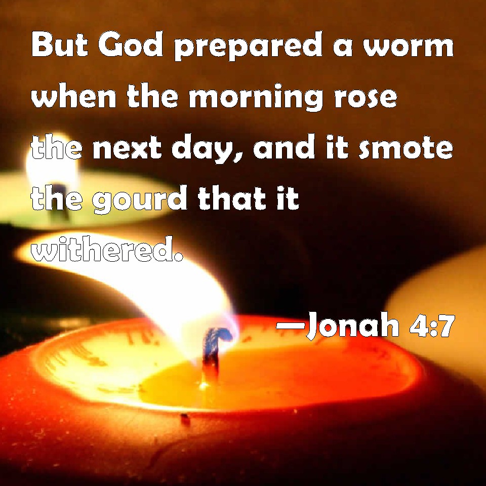 Choose a Background Jonah 4:7 But God prepared a worm when the morning rose the next day, and it smote the gourd that it withered. KJV: But God prepared a worm when the morning rose the next day, and it smote the gourd that it withered. DRB: But God prepared a worm, when the morning arose on the following day: and it struck the ivy and it withered. DBT: But God prepared a worm when the morning rose the next day, and it smote the gourd, that it withered. ERV: But God prepared a worm when the morning rose the next day, and it smote the gourd, that it withered. WBT: But God prepared a worm when the morning rose the next day, and it smote the gourd that it withered. WEB: But God prepared a worm at dawn the next day, and it chewed on the vine, so that it withered. YLT: And God appointeth a worm at the going up of the dawn on the morrow, and it smiteth the gourd, and it drieth up.Links Jonah 4:7 NIV • Jonah 4:7 NLT • Jonah 4:7 ESV • Jonah 4:7 NASB • Jonah 4:7 KJV • Jonah 4:7 Interlinear • Jonah 4:7 Commentaries • Jonah 4:7 Parallel Texts • Jonah 4:7 Bible Apps • Jonah 4:7 Parallel • Bible Hub |