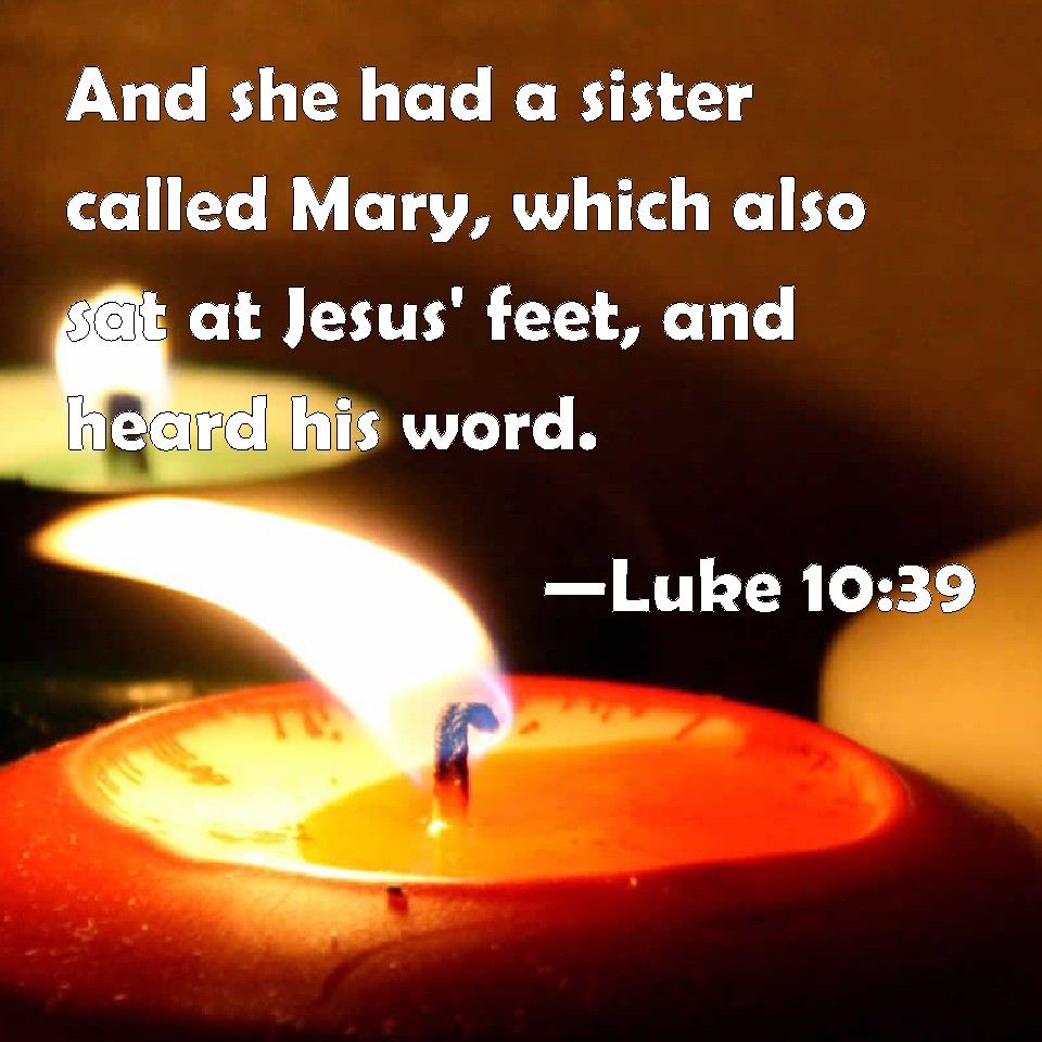 Choose a Background Luke 10:39 And she had a sister called Mary, which also sat at Jesus' feet, and heard his word. KJV: And she had a sister called Mary, which also sat at Jesus' feet, and heard his word. DRB: And she had a sister called Mary, who sitting also at the Lord's feet, heard his word. DBT: And she had a sister called Mary, who also, having sat down at the feet of Jesus was listening to his word. ERV: And she had a sister called Mary, which also sat at the Lord's feet, and heard his word. WBT: And she had a sister called Mary, who also sat at Jesus' feet, and heard his word. WEB: She had a sister called Mary, who also sat at Jesus' feet, and heard his word. YLT: and she had also a sister, called Mary, who also, having seated herself beside the feet of Jesus, was hearing the word,Links Luke 10:39 NIV • Luke 10:39 NLT • Luke 10:39 ESV • Luke 10:39 NASB • Luke 10:39 KJV • Luke 10:39 Interlinear • Luke 10:39 Commentaries • Luke 10:39 Parallel Texts • Luke 10:39 Bible Apps • Luke 10:39 Parallel • Bible Hub |