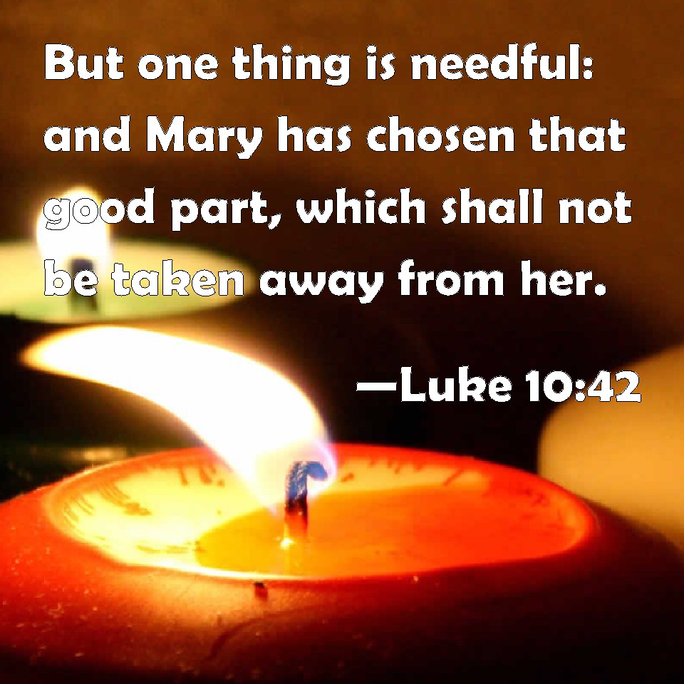Choose a Background Luke 10:42 But one thing is needful: and Mary has chosen that good part, which shall not be taken away from her. KJV: But one thing is needful: and Mary hath chosen that good part, which shall not be taken away from her. DRB: But one thing is necessary. Mary hath chosen the best part, which shall not be taken away from her. DBT: but there is need of one, and Mary has chosen the good part, the which shall not be taken from her. ERV: but one thing is needful: for Mary hath chosen the good part, which shall not be taken away from her. WBT: But one thing is needful; and Mary hath chosen that good part, which shall not be taken away from her. WEB: but one thing is needed. Mary has chosen the good part, which will not be taken away from her." YLT: but of one thing there is need, and Mary the good part did choose, that shall not be taken away from her.'Links Luke 10:42 NIV • Luke 10:42 NLT • Luke 10:42 ESV • Luke 10:42 NASB • Luke 10:42 KJV • Luke 10:42 Interlinear • Luke 10:42 Commentaries • Luke 10:42 Parallel Texts • Luke 10:42 Bible Apps • Luke 10:42 Parallel • Bible Hub |