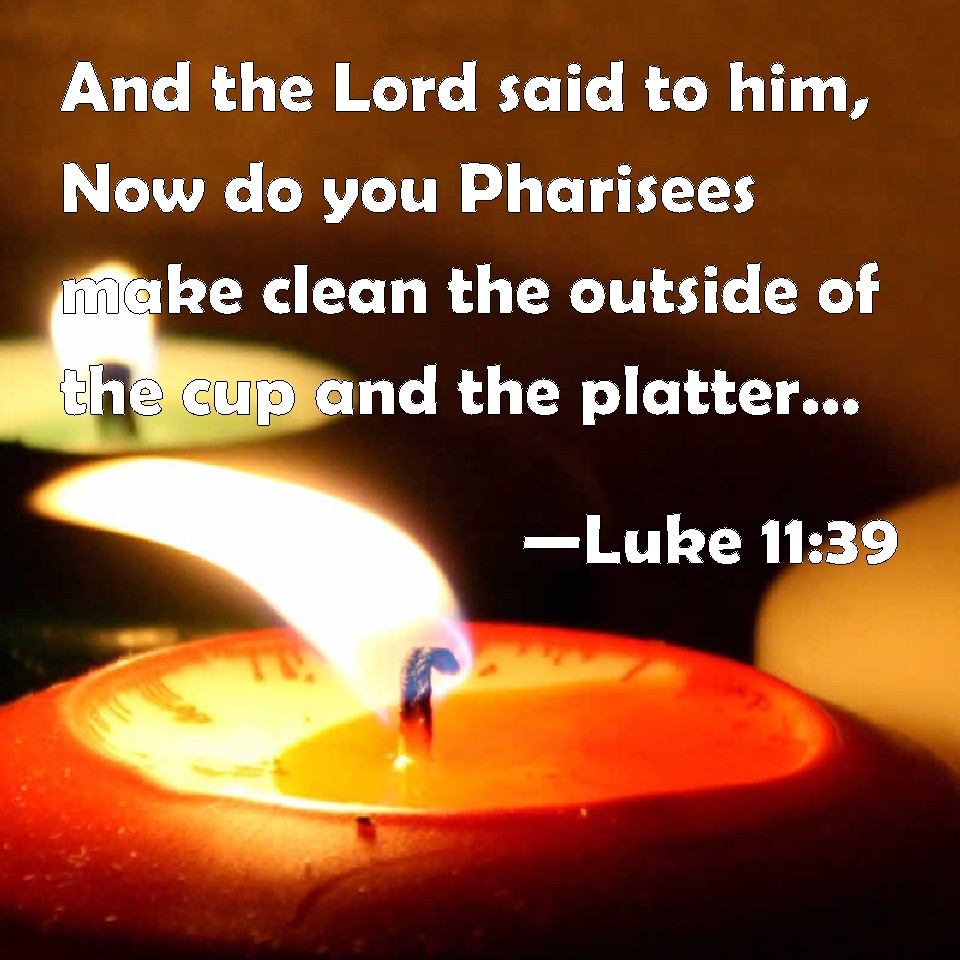 Choose a Background Luke 11:39 And the Lord said to him, Now do you Pharisees make clean the outside of the cup and the platter; but your inward part is full of ravening and wickedness. KJV: And the Lord said unto him, Now do ye Pharisees make clean the outside of the cup and the platter; but your inward part is full of ravening and wickedness. DRB: And the Lord said to him: Now you Pharisees make clean the outside of the cup and of the platter; but your inside is full of rapine and iniquity. DBT: But the Lord said to him, Now do ye Pharisees cleanse the outside of the cup and of the dish, but your inward parts are full of plunder and wickedness. ERV: And the Lord said unto him, Now do ye Pharisees cleanse the outside of the cup and of the platter; but your inward part is full of extortion and wickedness. WBT: And the Lord said to him, Now do ye Pharisees make clean the outside of the cup and the platter; but your inward part is full of ravening and wickedness. WEB: The Lord said to him, "Now you Pharisees cleanse the outside of the cup and of the platter, but your inward part is full of extortion and wickedness. YLT: And the Lord said unto him, 'Now do ye, the Pharisees, the outside of the cup and of the plate make clean, but your inward part is full of rapine and wickedness;Links Luke 11:39 NIV • Luke 11:39 NLT • Luke 11:39 ESV • Luke 11:39 NASB • Luke 11:39 KJV • Luke 11:39 Interlinear • Luke 11:39 Commentaries • Luke 11:39 Parallel Texts • Luke 11:39 Bible Apps • Luke 11:39 Parallel • Bible Hub |