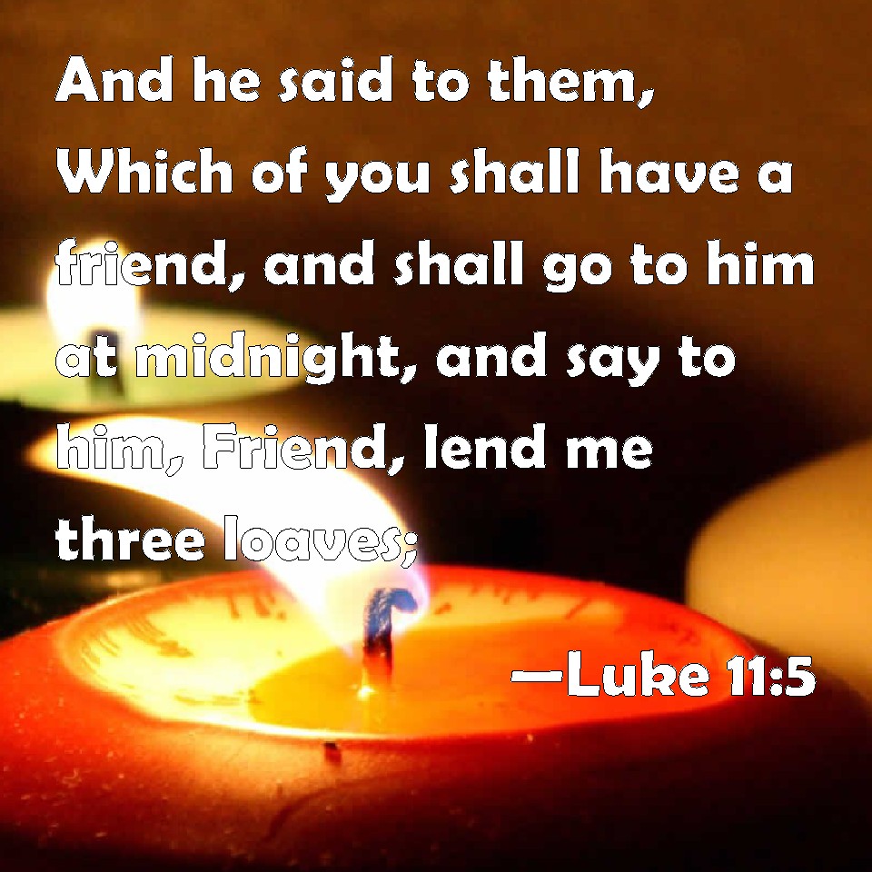 Choose a Background Luke 11:5 And he said to them, Which of you shall have a friend, and shall go to him at midnight, and say to him, Friend, lend me three loaves; KJV: And he said unto them, Which of you shall have a friend, and shall go unto him at midnight, and say unto him, Friend, lend me three loaves; DRB: And he said to them: Which of you shall have a friend, and shall go to him at midnight, and shall say to him: Friend, lend me three loaves, DBT: And he said to them, Who among you shall have a friend, and shall go to him at midnight and say to him, Friend, let me have three loaves, ERV: And he said unto them, Which of you shall have a friend, and shall go unto him at midnight, and say to him, Friend, lend me three loaves; WBT: And he said to them, Which of you shall have a friend, and shall go to him at midnight, and say to him, Friend, lend me three loaves: WEB: He said to them, "Which of you, if you go to a friend at midnight, and tell him, 'Friend, lend me three loaves of bread, YLT: And he said unto them, 'Who of you shall have a friend, and shall go on unto him at midnight, and may say to him, Friend, lend me three loaves,Links Luke 11:5 NIV • Luke 11:5 NLT • Luke 11:5 ESV • Luke 11:5 NASB • Luke 11:5 KJV • Luke 11:5 Interlinear • Luke 11:5 Commentaries • Luke 11:5 Parallel Texts • Luke 11:5 Bible Apps • Luke 11:5 Parallel • Bible Hub |