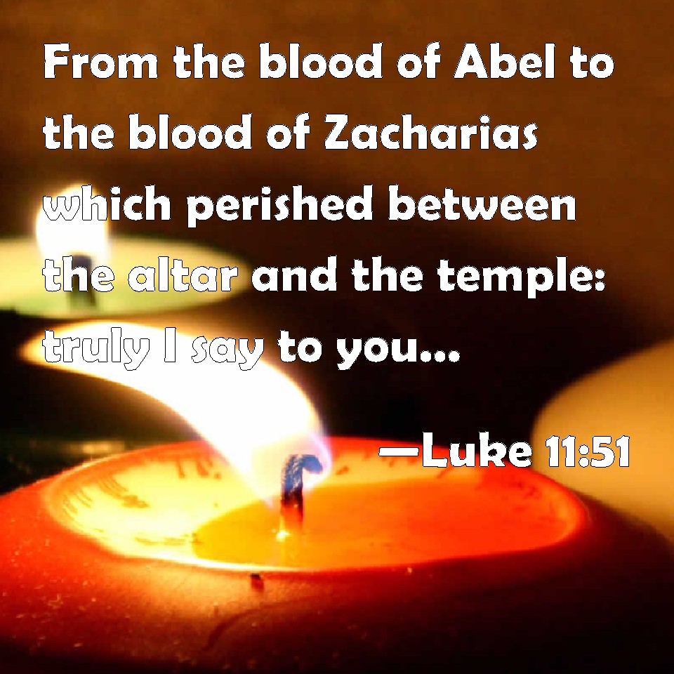 Choose a Background Luke 11:51 From the blood of Abel to the blood of Zacharias which perished between the altar and the temple: truly I say to you, It shall be required of this generation. KJV: From the blood of Abel unto the blood of Zacharias, which perished between the altar and the temple: verily I say unto you, It shall be required of this generation. DRB: From the blood of Abel unto the blood of Zacharias, who was slain between the alter and the temple: Yea I say to you, It shall be required of this generation. DBT: from the blood of Abel to the blood of Zacharias, who perished between the altar and the house; yea, I say to you, it shall be required of this generation. ERV: from the blood of Abel unto the blood of Zachariah, who perished between the altar and the sanctuary: yea, I say unto you, it shall be required of this generation. WBT: From the blood of Abel to the blood of Zacharias, who perished between the altar and the temple: verily I say to you, It shall be required of this generation. WEB: from the blood of Abel to the blood of Zachariah, who perished between the altar and the sanctuary.' Yes, I tell you, it will be required of this generation. YLT: from the blood of Abel unto the blood of Zacharias, who perished between the altar and the house; yes, I say to you, It shall be required from this generation.Links Luke 11:51 NIV • Luke 11:51 NLT • Luke 11:51 ESV • Luke 11:51 NASB • Luke 11:51 KJV • Luke 11:51 Interlinear • Luke 11:51 Commentaries • Luke 11:51 Parallel Texts • Luke 11:51 Bible Apps • Luke 11:51 Parallel • Bible Hub |