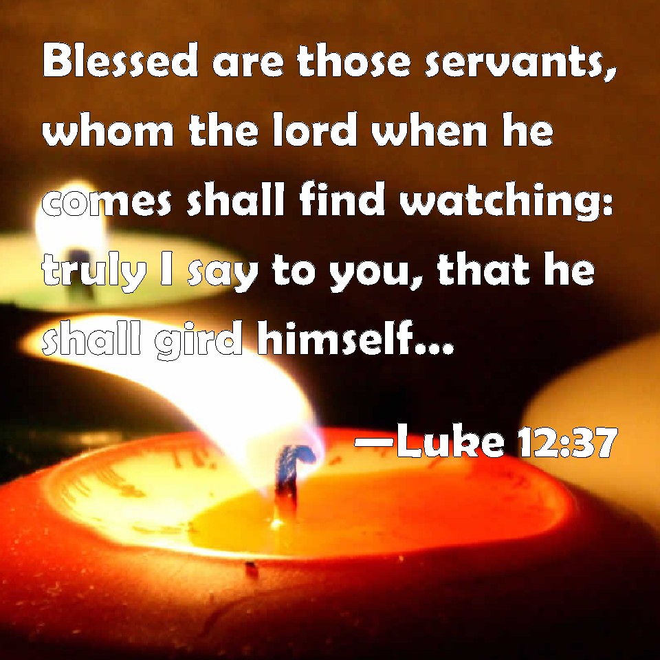 Choose a Background Luke 12:37 Blessed are those servants, whom the lord when he comes shall find watching: truly I say to you, that he shall gird himself, and make them to sit down to meat, and will come forth and serve them. KJV: Blessed are those servants, whom the lord when he cometh shall find watching: verily I say unto you, that he shall gird himself, and make them to sit down to meat, and will come forth and serve them. DRB: Blessed are those servants, whom the Lord when he cometh, shall find watching. Amen I say to you, that he will gird himself, and make them sit down to meat, and passing will minister unto them. DBT: Blessed are those bondmen whom the lord on coming shall find watching; verily I say unto you, that he will gird himself and make them recline at table, and coming up will serve them. ERV: Blessed are those servants, whom the lord when he cometh shall find watching: verily I say unto you, that he shall gird himself, and make them sit down to meat, and shall come and serve them. WBT: Blessed are those servants, whom the lord when he cometh shall find watching: verily I say to you, that he will gird himself, and make them to sit down to eat, and will come forth and serve them. WEB: Blessed are those servants, whom the lord will find watching when he comes. Most certainly I tell you, that he will dress himself, and make them recline, and will come and serve them. YLT: 'Happy those servants, whom the lord, having come, shall find watching; verily I say to you, that he will gird himself, and will cause them to recline (at meat), and having come near, will minister to them;Links Luke 12:37 NIV • Luke 12:37 NLT • Luke 12:37 ESV • Luke 12:37 NASB • Luke 12:37 KJV • Luke 12:37 Interlinear • Luke 12:37 Commentaries • Luke 12:37 Parallel Texts • Luke 12:37 Bible Apps • Luke 12:37 Parallel • Bible Hub |