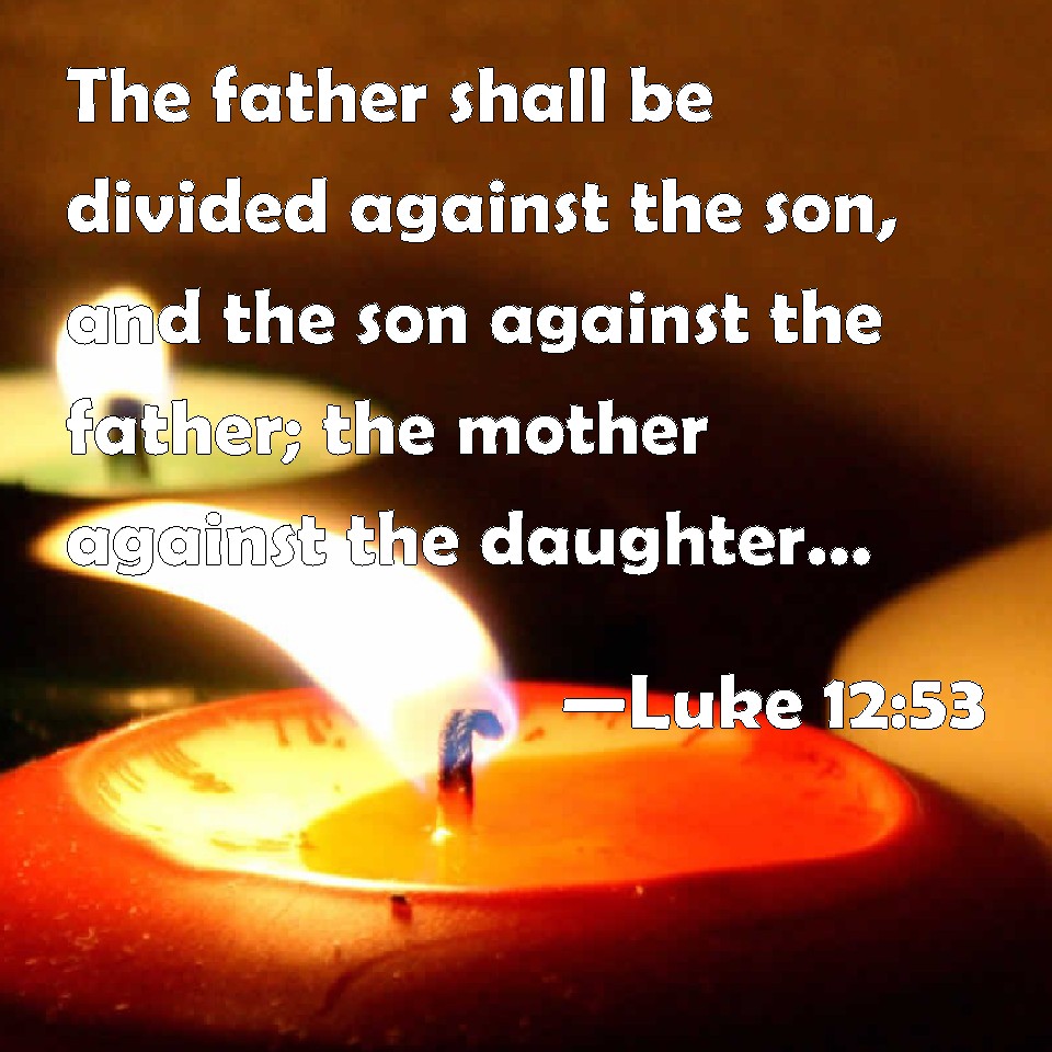 Choose a Background Luke 12:53 The father shall be divided against the son, and the son against the father; the mother against the daughter, and the daughter against the mother; the mother in law against her daughter in law, and the daughter in law against her mother in law. KJV: The father shall be divided against the son, and the son against the father; the mother against the daughter, and the daughter against the mother; the mother in law against her daughter in law, and the daughter in law against her mother in law. DRB: The father shall be divided against the son, and the son against his father, the mother against the daughter, and the daughter against the mother, the mother in law against her daughter in law, and the daughter in law against her mother in law. DBT: father against son, and son against father; mother against daughter, and daughter against mother; a mother-in-law against her daughter-in-law, and a daughter-in-law against her mother-in-law. ERV: They shall be divided, father against son, and son against father; mother against daughter, and daughter against her mother; mother in law against her daughter in law, and daughter in law against her mother in law. WBT: The father will be divided against the son, and the son against the father; the mother against the daughter, and the daughter against the mother; the mother-in-law against her daughter-in-law, and the daughter-in-law against her mother-in-law. WEB: They will be divided, father against son, and son against father; mother against daughter, and daughter against her mother; mother-in-law against her daughter-in-law, and daughter-in-law against her mother-in-law." YLT: a father shall be divided against a son, and a son against a father, a mother against a daughter, and a daughter against a mother, a mother-in-law against her daughter-in-law, and a daughter-in-law against her mother-in-law.'Links Luke 12:53 NIV • Luke 12:53 NLT • Luke 12:53 ESV • Luke 12:53 NASB • Luke 12:53 KJV • Luke 12:53 Interlinear • Luke 12:53 Commentaries • Luke 12:53 Parallel Texts • Luke 12:53 Bible Apps • Luke 12:53 Parallel • Bible Hub |