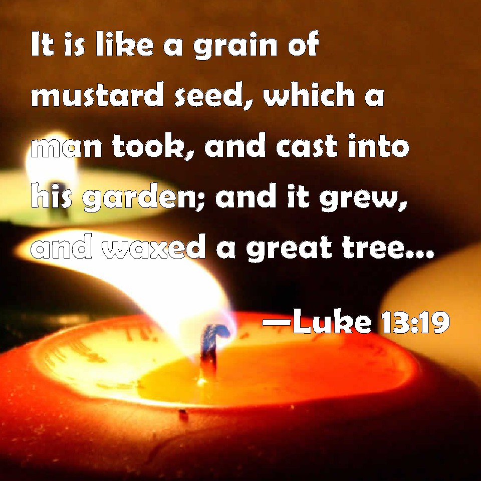 Choose a Background Luke 13:19 It is like a grain of mustard seed, which a man took, and cast into his garden; and it grew, and waxed a great tree; and the fowls of the air lodged in the branches of it. KJV: It is like a grain of mustard seed, which a man took, and cast into his garden; and it grew, and waxed a great tree; and the fowls of the air lodged in the branches of it. DRB: It is like to a grain of mustard seed, which a man took and cast into his garden, and it grew and became a great tree, and the birds of the air lodged in the branches thereof. DBT: It is like a grain of mustard seed which a man took and cast into his garden; and it grew and became a great tree, and the birds of heaven lodged in its branches. ERV: It is like unto a grain of mustard seed, which a man took, and cast into his own garden; and it grew, and became a tree; and the birds of the heaven lodged in the branches thereof. WBT: It is like a grain of mustard-seed, which a man took, and cast into his garden, and it grew, and became a great tree; and the fowls of the air lodged in the branches of it. WEB: It is like a grain of mustard seed, which a man took, and put in his own garden. It grew, and became a large tree, and the birds of the sky lodged in its branches." YLT: It is like to a grain of mustard, which a man having taken, did cast into his garden, and it increased, and came to a great tree, and the fowls of the heavens did rest in its branches.'Links Luke 13:19 NIV • Luke 13:19 NLT • Luke 13:19 ESV • Luke 13:19 NASB • Luke 13:19 KJV • Luke 13:19 Interlinear • Luke 13:19 Commentaries • Luke 13:19 Parallel Texts • Luke 13:19 Bible Apps • Luke 13:19 Parallel • Bible Hub |