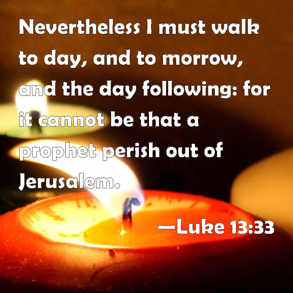 Choose a Background Luke 13:33 Nevertheless I must walk to day, and to morrow, and the day following: for it cannot be that a prophet perish out of Jerusalem. KJV: Nevertheless I must walk to day, and to morrow, and the day following: for it cannot be that a prophet perish out of Jerusalem. DRB: Nevertheless I must walk to day and to morrow, and the day following, because it cannot be that a prophet perish, out of Jerusalem. DBT: but I must needs walk to-day and to-morrow and the day following, for it must not be that a prophet perish out of Jerusalem. ERV: Howbeit I must go on my way today and tomorrow and the day following: for it cannot be that a prophet perish out of Jerusalem. WBT: Nevertheless, I must walk to-day and to-morrow, and the day following: for it cannot be that a prophet should perish out of Jerusalem. WEB: Nevertheless I must go on my way today and tomorrow and the next day, for it can't be that a prophet perish outside of Jerusalem.' YLT: but it behoveth me to-day, and to-morrow, and the day following, to go on, because it is not possible for a prophet to perish out of Jerusalem.Links Luke 13:33 NIV • Luke 13:33 NLT • Luke 13:33 ESV • Luke 13:33 NASB • Luke 13:33 KJV • Luke 13:33 Interlinear • Luke 13:33 Commentaries • Luke 13:33 Parallel Texts • Luke 13:33 Bible Apps • Luke 13:33 Parallel • Bible Hub |