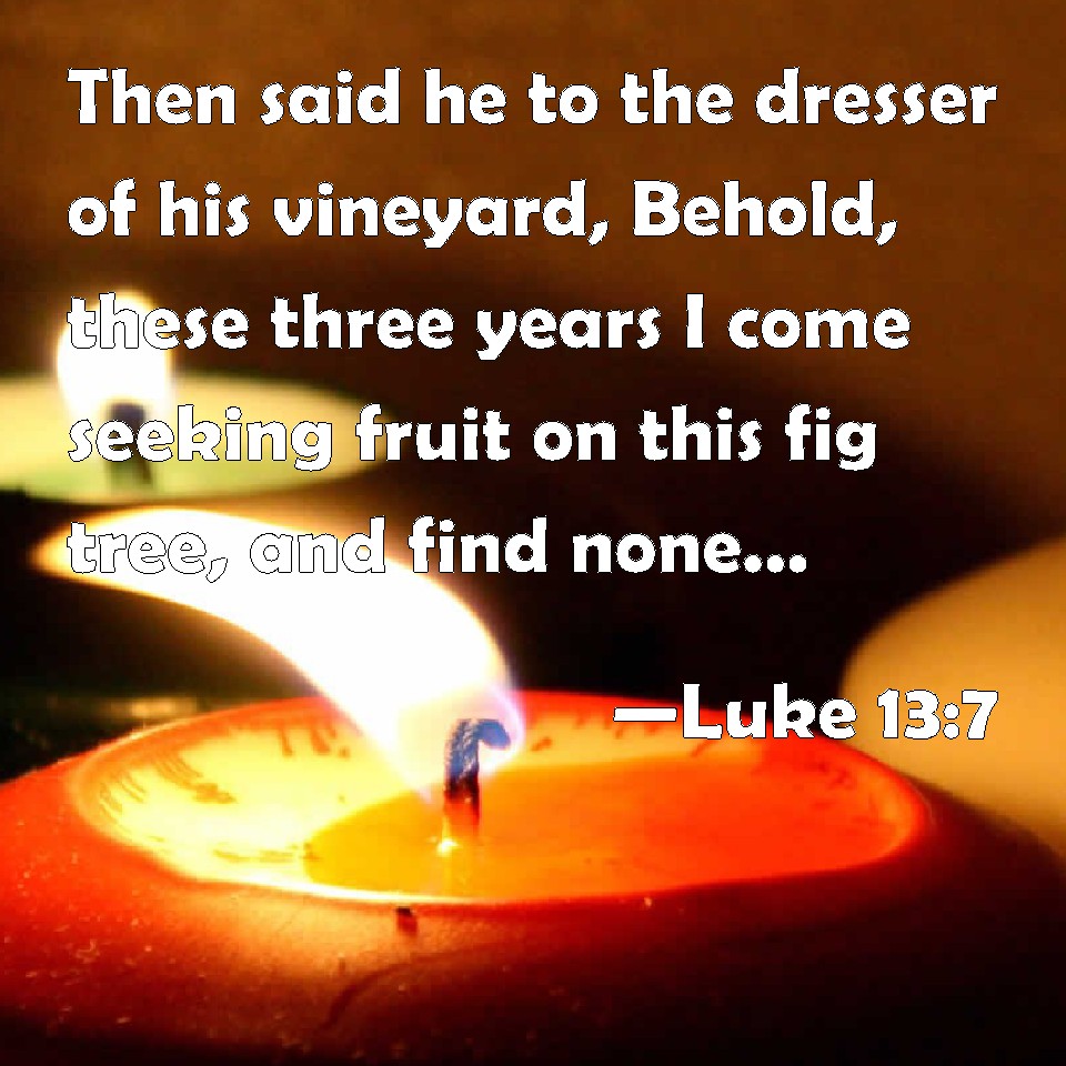Luke 13:7 Then said he to the dresser of his vineyard, Behold, these three years I come seeking fruit on this fig tree, and find none: cut it down; why encumbers it the ground?