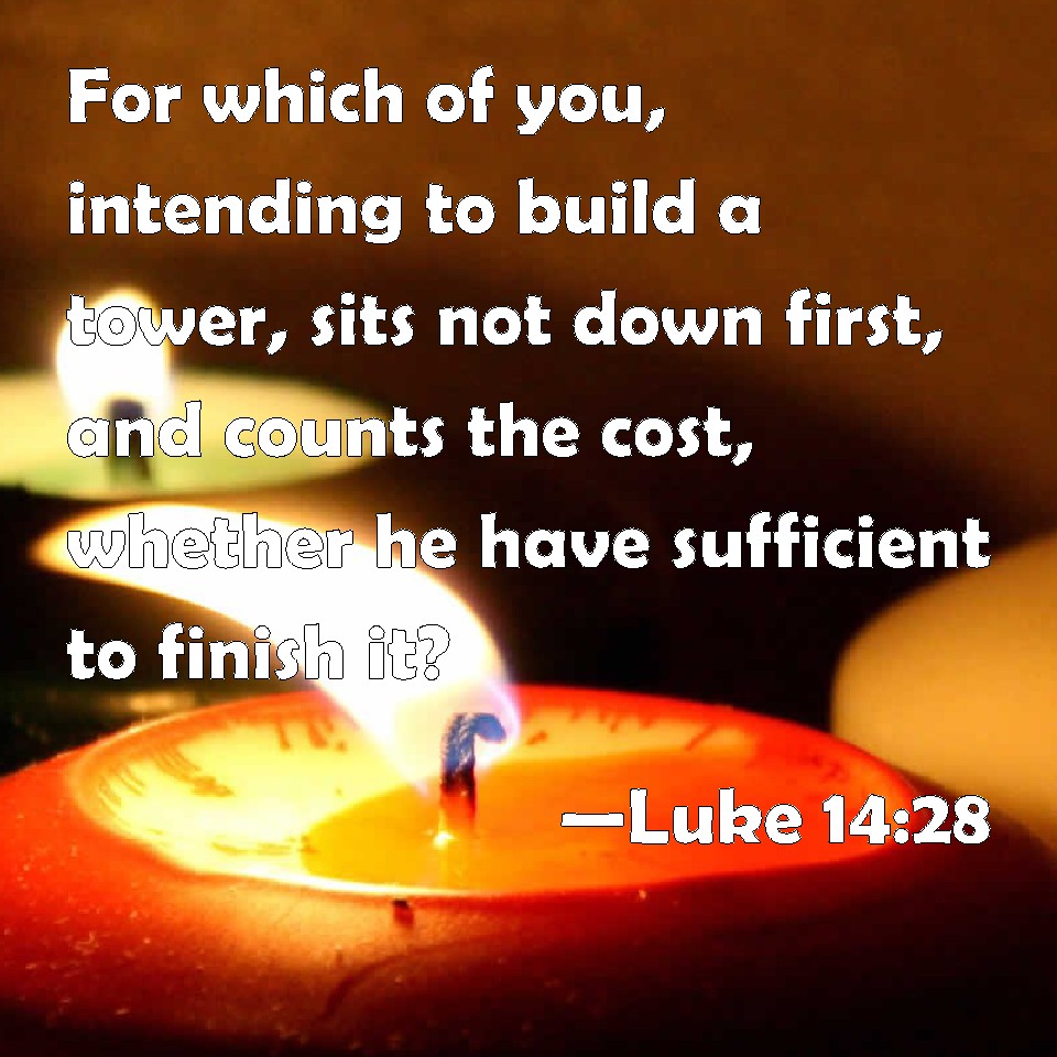 Choose a Background Luke 14:28 For which of you, intending to build a tower, sits not down first, and counts the cost, whether he have sufficient to finish it? KJV: For which of you, intending to build a tower, sitteth not down first, and counteth the cost, whether he have sufficient to finish it? DRB: For which of you having a mind to build a tower, doth not first sit down, and reckon the charges that are necessary, whether he have wherewithal to finish it: DBT: For which of you, desirous of building a tower, does not first sit down and count the cost, if he have what is needed to complete it; ERV: For which of you, desiring to build a tower, doth not first sit down and count the cost, whether he have wherewith to complete it? WBT: For which of you intending to build a tower, sitteth not down first, and counteth the cost, whether he hath sufficient to finish it? WEB: For which of you, desiring to build a tower, doesn't first sit down and count the cost, to see if he has enough to complete it? YLT: 'For who of you, willing to build a tower, doth not first, having sat down, count the expence, whether he have the things for completing?Links Luke 14:28 NIV • Luke 14:28 NLT • Luke 14:28 ESV • Luke 14:28 NASB • Luke 14:28 KJV • Luke 14:28 Interlinear • Luke 14:28 Commentaries • Luke 14:28 Parallel Texts • Luke 14:28 Bible Apps • Luke 14:28 Parallel • Bible Hub |