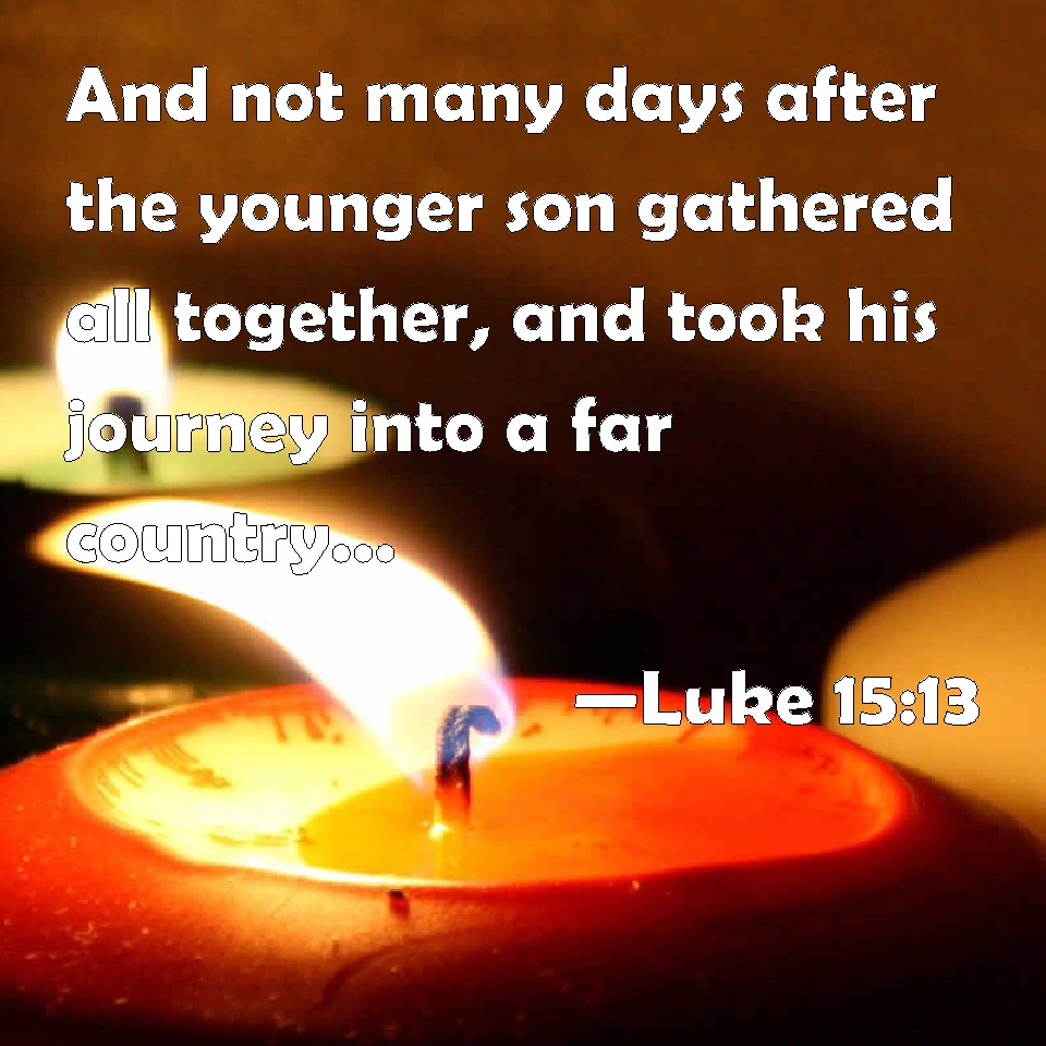 Choose a Background Luke 15:13 And not many days after the younger son gathered all together, and took his journey into a far country, and there wasted his substance with riotous living. KJV: And not many days after the younger son gathered all together, and took his journey into a far country, and there wasted his substance with riotous living. DRB: And not many days after, the younger son, gathering all together, went abroad into a far country: and there wasted his substance, living riotously. DBT: And after not many days the younger son gathering all together went away into a country a long way off, and there dissipated his property, living in debauchery. ERV: And not many days after the younger son gathered all together, and took his journey into a far country; and there he wasted his substance with riotous living. WBT: And not many days after, the younger son gathered all together, and took his journey into a far country, and there wasted his substance with riotous living. WEB: Not many days after, the younger son gathered all of this together and traveled into a far country. There he wasted his property with riotous living. YLT: 'And not many days after, having gathered all together, the younger son went abroad to a far country, and there he scattered his substance, living riotously;Links Luke 15:13 NIV • Luke 15:13 NLT • Luke 15:13 ESV • Luke 15:13 NASB • Luke 15:13 KJV • Luke 15:13 Interlinear • Luke 15:13 Commentaries • Luke 15:13 Parallel Texts • Luke 15:13 Bible Apps • Luke 15:13 Parallel • Bible Hub |