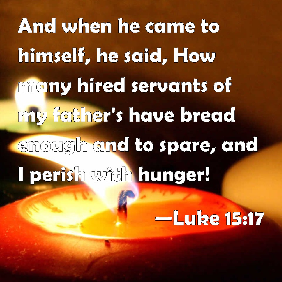 Choose a Background Luke 15:17 And when he came to himself, he said, How many hired servants of my father's have bread enough and to spare, and I perish with hunger! KJV: And when he came to himself, he said, How many hired servants of my father's have bread enough and to spare, and I perish with hunger! DRB: And returning to himself, he said: How many hired servants in my father's house abound with bread, and I here perish with hunger? DBT: And coming to himself, he said, How many hired servants of my father's have abundance of bread, and I perish here by famine. ERV: But when he came to himself he said, How many hired servants of my father's have bread enough and to spare, and I perish here with hunger! WBT: And when he came to himself, he said, How many hired servants of my father have bread enough and to spare, and I am perishing with hunger! WEB: But when he came to himself he said, 'How many hired servants of my father's have bread enough to spare, and I'm dying with hunger! YLT: 'And having come to himself, he said, How many hirelings of my father have a superabundance of bread, and I here with hunger am perishing!Links Luke 15:17 NIV • Luke 15:17 NLT • Luke 15:17 ESV • Luke 15:17 NASB • Luke 15:17 KJV • Luke 15:17 Interlinear • Luke 15:17 Commentaries • Luke 15:17 Parallel Texts • Luke 15:17 Bible Apps • Luke 15:17 Parallel • Bible Hub |