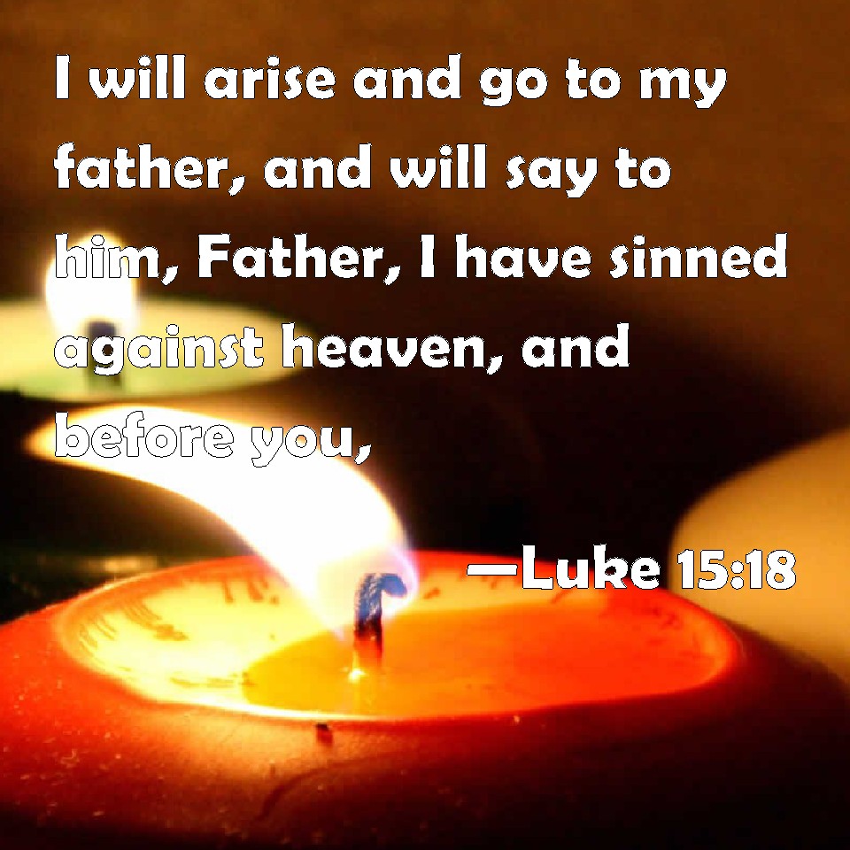Choose a Background Luke 15:18 I will arise and go to my father, and will say to him, Father, I have sinned against heaven, and before you, KJV: I will arise and go to my father, and will say unto him, Father, I have sinned against heaven, and before thee, DRB: I will arise, and will go to my father, and say to him: Father, I have sinned against heaven, and before thee: DBT: I will rise up and go to my father, and I will say to him, Father, I have sinned against heaven and before thee; ERV: I will arise and go to my father, and will say unto him, Father, I have sinned against heaven, and in thy sight: WBT: I will arise and go to my father, and will say to him, Father, I have sinned against heaven, and before thee, WEB: I will get up and go to my father, and will tell him, "Father, I have sinned against heaven, and in your sight. YLT: having risen, I will go on unto my father, and will say to him, Father, I did sin — to the heaven, and before thee,Links Luke 15:18 NIV • Luke 15:18 NLT • Luke 15:18 ESV • Luke 15:18 NASB • Luke 15:18 KJV • Luke 15:18 Interlinear • Luke 15:18 Commentaries • Luke 15:18 Parallel Texts • Luke 15:18 Bible Apps • Luke 15:18 Parallel • Bible Hub |