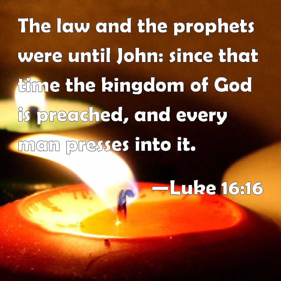 Luke 16:16 The law and the prophets were until John: since that time the kingdom of God is preached, and every man presses into it.