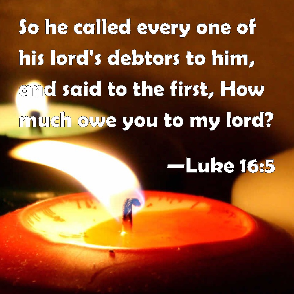 Choose a Background Luke 16:5 So he called every one of his lord's debtors to him, and said to the first, How much owe you to my lord? KJV: So he called every one of his lord's debtors unto him, and said unto the first, How much owest thou unto my lord? DRB: Therefore calling together every one of his lord's debtors, he said to the first: How much dost thou owe my lord? DBT: And having called to him each one of the debtors of his own lord, he said to the first, How much owest thou to my lord? ERV: And calling to him each one of his lord's debtors, he said to the first, How much owest thou unto my lord? WBT: So he called every one of his lord's debtors, and said to the first, How much owest thou to my lord? WEB: Calling each one of his lord's debtors to him, he said to the first, 'How much do you owe to my lord?' YLT: 'And having called near each one of his lord's debtors, he said to the first, How much dost thou owe to my lord?Links Luke 16:5 NIV • Luke 16:5 NLT • Luke 16:5 ESV • Luke 16:5 NASB • Luke 16:5 KJV • Luke 16:5 Interlinear • Luke 16:5 Commentaries • Luke 16:5 Parallel Texts • Luke 16:5 Bible Apps • Luke 16:5 Parallel • Bible Hub |