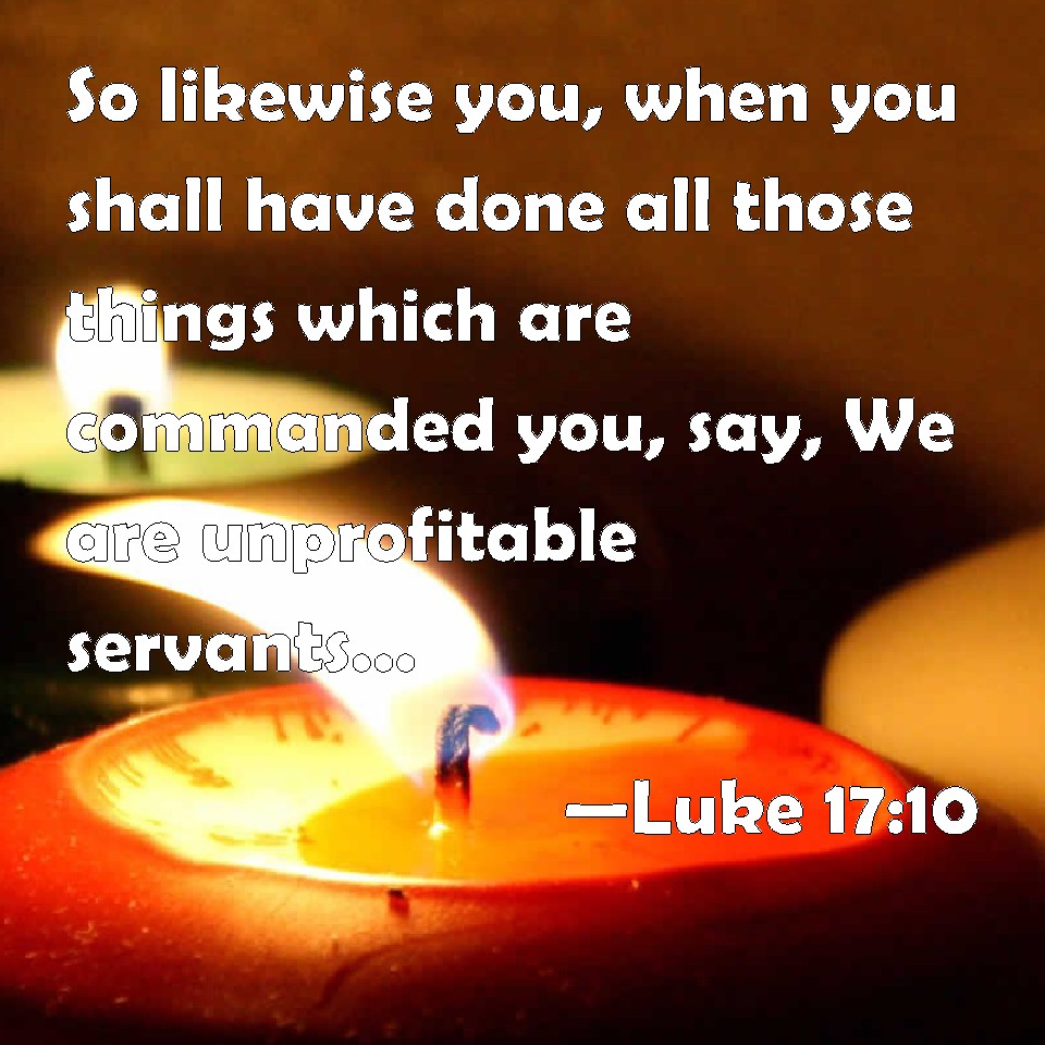 Choose a Background Luke 17:10 So likewise you, when you shall have done all those things which are commanded you, say, We are unprofitable servants: we have done that which was our duty to do. KJV: So likewise ye, when ye shall have done all those things which are commanded you, say, We are unprofitable servants: we have done that which was our duty to do. DRB: I think not. So you also, when you shall have done all these things that are commanded you, say: We are unprofitable servants; we have done that which we ought to do. DBT: Thus ye also, when ye shall have done all things that have been ordered you, say, We are unprofitable bondmen; we have done what it was our duty to do. ERV: Even so ye also, when ye shall have done all the things that are commanded you, say, We are unprofitable servants; we have done that which it was our duty to do. WBT: So likewise ye, when ye shall have done all the things which are commanded you, say, We are unprofitable servants: we have done that which it was our duty to do. WEB: Even so you also, when you have done all the things that are commanded you, say, 'We are unworthy servants. We have done our duty.'" YLT: So also ye, when ye may have done all the things directed you, say — We are unprofitable servants, because that which we owed to do — we have done.'Links Luke 17:10 NIV • Luke 17:10 NLT • Luke 17:10 ESV • Luke 17:10 NASB • Luke 17:10 KJV • Luke 17:10 Interlinear • Luke 17:10 Commentaries • Luke 17:10 Parallel Texts • Luke 17:10 Bible Apps • Luke 17:10 Parallel • Bible Hub |