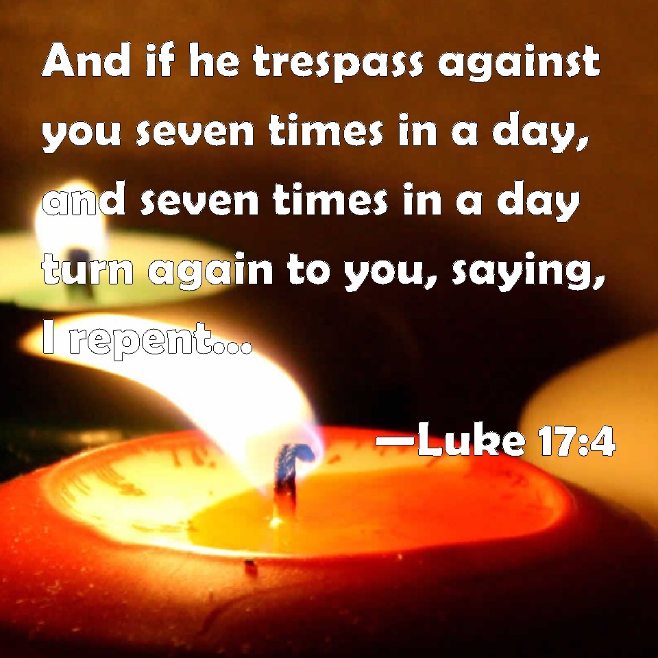 Choose a Background Luke 17:4 And if he trespass against you seven times in a day, and seven times in a day turn again to you, saying, I repent; you shall forgive him. KJV: And if he trespass against thee seven times in a day, and seven times in a day turn again to thee, saying, I repent; thou shalt forgive him. DRB: And if he sin against thee seven times in a day, and seven times in a day be converted unto thee, saying, I repent; forgive him. DBT: And if he should sin against thee seven times in the day, and seven times should return to thee, saying, I repent, thou shalt forgive him. ERV: And if he sin against thee seven times in the day, and seven times turn again to thee, saying, I repent; thou shalt forgive him. WBT: And if he shall trespass against thee seven times in a day, and seven times in a day shall turn again to thee, saying, I repent; thou shalt forgive him. WEB: If he sins against you seven times in the day, and seven times returns, saying, 'I repent,' you shall forgive him." YLT: and if seven times in the day he may sin against thee, and seven times in the day may turn back to thee, saying, I reform; thou shalt forgive him.'Links Luke 17:4 NIV • Luke 17:4 NLT • Luke 17:4 ESV • Luke 17:4 NASB • Luke 17:4 KJV • Luke 17:4 Interlinear • Luke 17:4 Commentaries • Luke 17:4 Parallel Texts • Luke 17:4 Bible Apps • Luke 17:4 Parallel • Bible Hub |