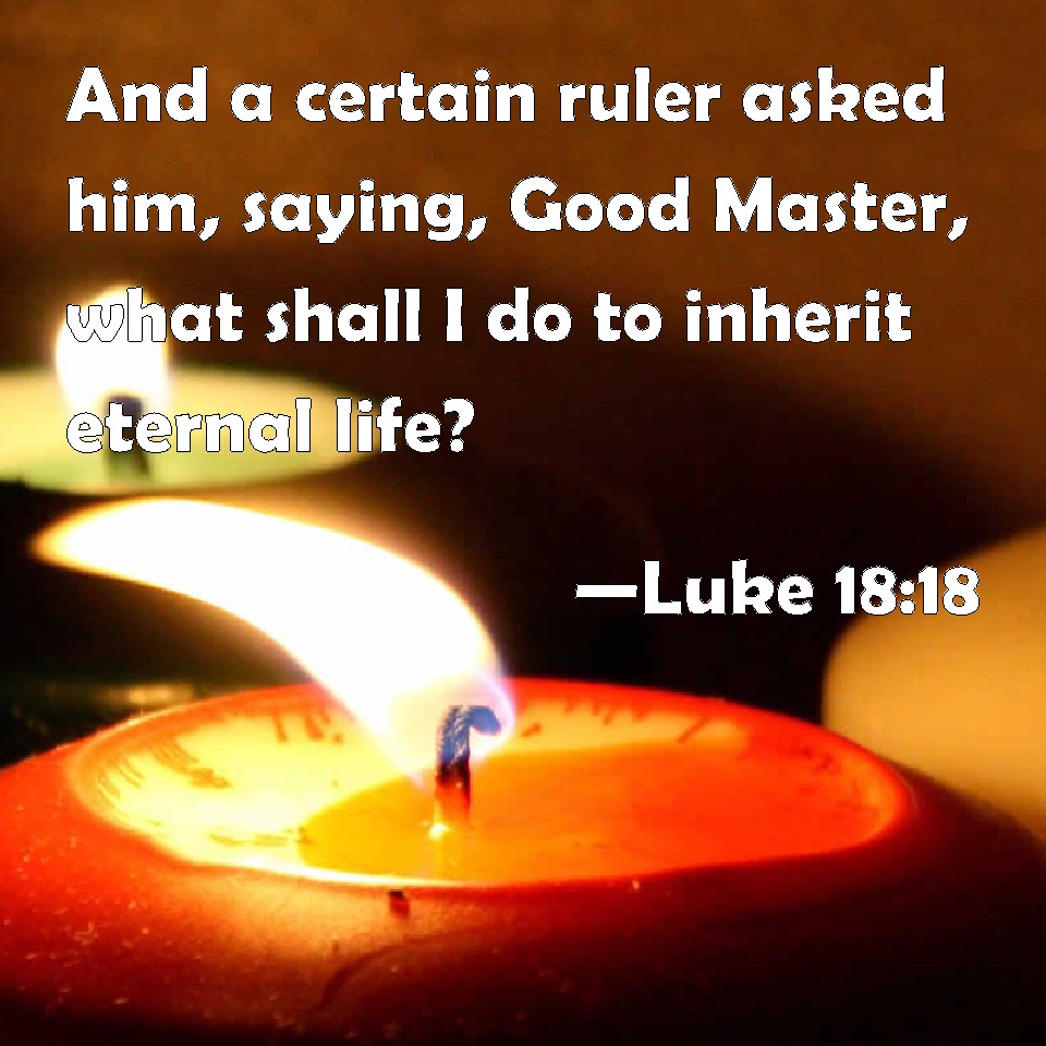 Choose a Background Luke 18:18 And a certain ruler asked him, saying, Good Master, what shall I do to inherit eternal life? KJV: And a certain ruler asked him, saying, Good Master, what shall I do to inherit eternal life? DRB: And a certain ruler asked him, saying: Good master, what shall I do to possess everlasting life? DBT: And a certain ruler asked him saying, Good teacher, having done what, shall I inherit eternal life? ERV: And a certain ruler asked him, saying, Good Master, what shall I do to inherit eternal life? WBT: And a certain ruler asked him, saying, Good Master, what shall I do to inherit eternal life? WEB: A certain ruler asked him, saying, "Good Teacher, what shall I do to inherit eternal life?" YLT: And a certain ruler questioned him, saying, 'Good teacher, what having done — shall I inherit life age-during?'Links Luke 18:18 NIV • Luke 18:18 NLT • Luke 18:18 ESV • Luke 18:18 NASB • Luke 18:18 KJV • Luke 18:18 Interlinear • Luke 18:18 Commentaries • Luke 18:18 Parallel Texts • Luke 18:18 Bible Apps • Luke 18:18 Parallel • Bible Hub |