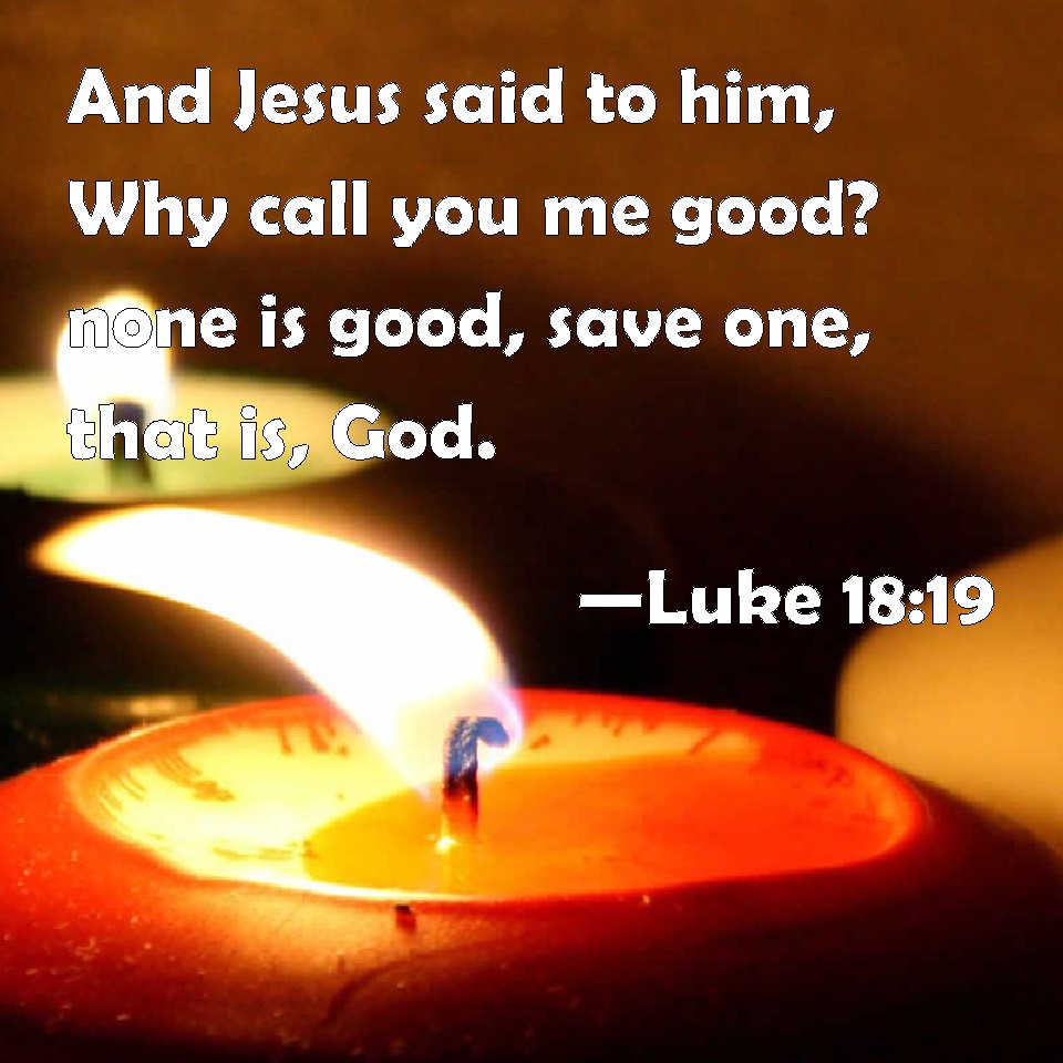 Choose a Background Luke 18:19 And Jesus said to him, Why call you me good? none is good, save one, that is, God. KJV: And Jesus said unto him, Why callest thou me good? none is good, save one, that is, God. DRB: And Jesus said to him: Why dost thou call me good? None is good but God alone. DBT: But Jesus said to him, Why callest thou me good? There is none good but one, God. ERV: And Jesus said unto him, Why callest thou me good? none is good, save one, even God. WBT: And Jesus said to him, Why callest thou me good? none is good, save one, that is God. WEB: Jesus asked him, "Why do you call me good? No one is good, except one—God. YLT: And Jesus said to him, 'Why me dost thou call good? no one is good, except One — God;Links Luke 18:19 NIV • Luke 18:19 NLT • Luke 18:19 ESV • Luke 18:19 NASB • Luke 18:19 KJV • Luke 18:19 Interlinear • Luke 18:19 Commentaries • Luke 18:19 Parallel Texts • Luke 18:19 Bible Apps • Luke 18:19 Parallel • Bible Hub |