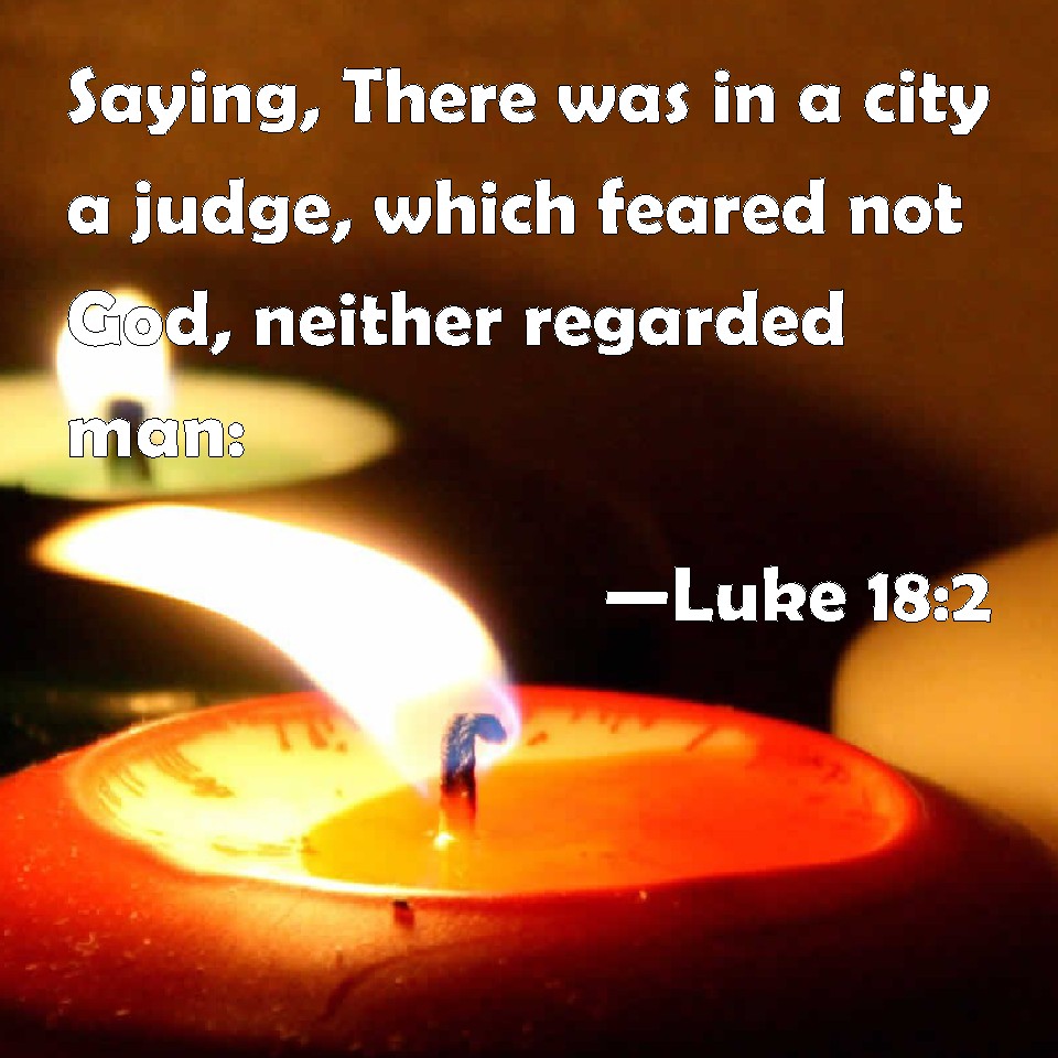 Choose a Background Luke 18:2 Saying, There was in a city a judge, which feared not God, neither regarded man: KJV: Saying, There was in a city a judge, which feared not God, neither regarded man: DRB: Saying: There was a judge in a certain city, who feared not God, nor regarded man. DBT: saying, There was a judge in a city, not fearing God and not respecting man: ERV: saying, There was in a city a judge, which feared not God, and regarded not man: WBT: Saying, There was in a city a judge, who feared not God, neither regarded man. WEB: saying, "There was a judge in a certain city who didn't fear God, and didn't respect man. YLT: saying, 'A certain judge was in a certain city — God he is not fearing, and man he is not regarding — Links Luke 18:2 NIV • Luke 18:2 NLT • Luke 18:2 ESV • Luke 18:2 NASB • Luke 18:2 KJV • Luke 18:2 Interlinear • Luke 18:2 Commentaries • Luke 18:2 Parallel Texts • Luke 18:2 Bible Apps • Luke 18:2 Parallel • Bible Hub |
