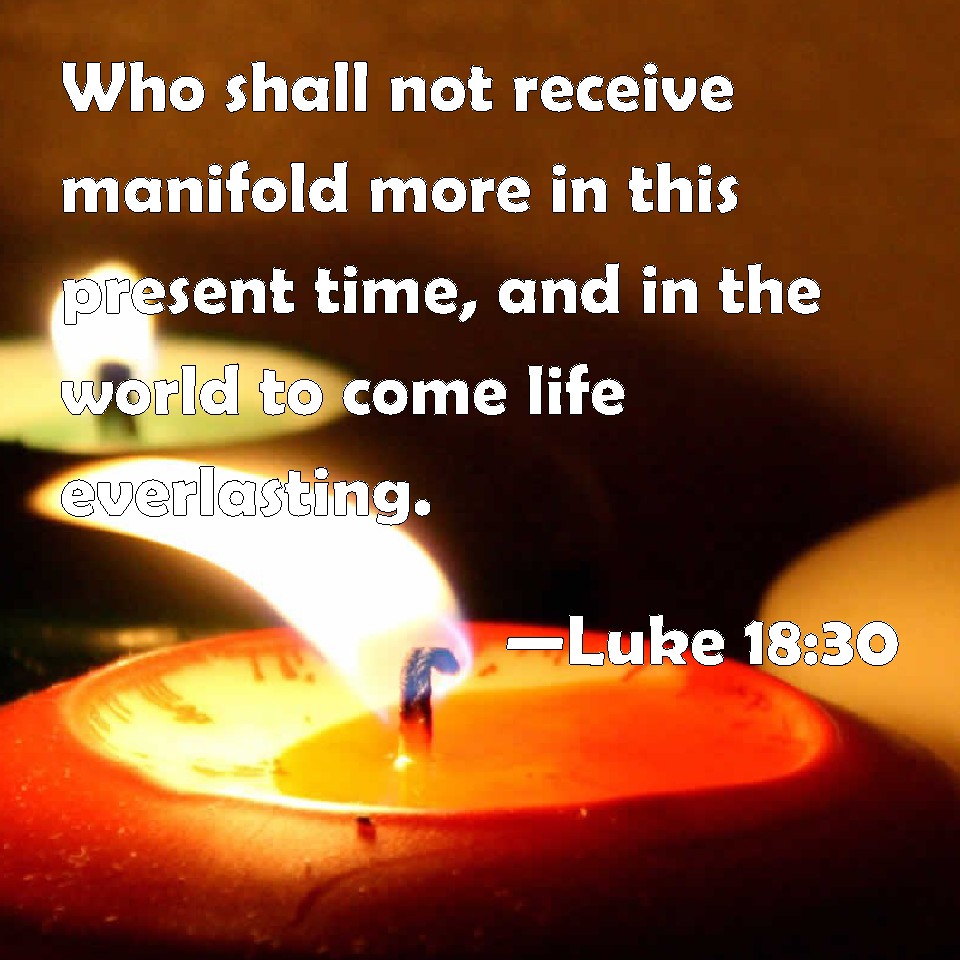 Choose a Background Luke 18:30 Who shall not receive manifold more in this present time, and in the world to come life everlasting. KJV: Who shall not receive manifold more in this present time, and in the world to come life everlasting. DRB: Who shall not receive much more in this present time, and in the world to come life everlasting. DBT: who shall not receive manifold more at this time, and in the coming age life eternal. ERV: who shall not receive manifold more in this time, and in the world to come eternal life. WBT: Who shall not receive manifold more in this present time, and in the world to come life everlasting. WEB: who will not receive many times more in this time, and in the world to come, eternal life." YLT: who may not receive back manifold more in this time, and in the coming age, life age-during.'Links Luke 18:30 NIV • Luke 18:30 NLT • Luke 18:30 ESV • Luke 18:30 NASB • Luke 18:30 KJV • Luke 18:30 Interlinear • Luke 18:30 Commentaries • Luke 18:30 Parallel Texts • Luke 18:30 Bible Apps • Luke 18:30 Parallel • Bible Hub |