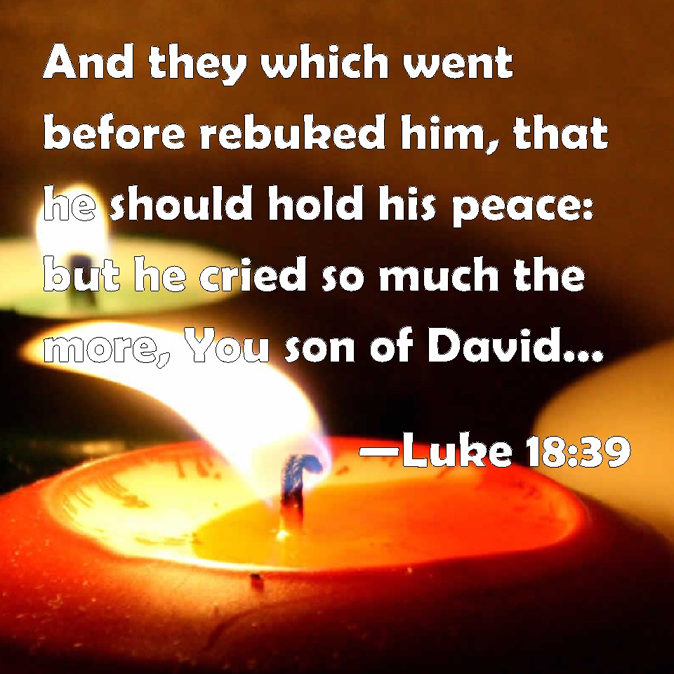 Choose a Background Luke 18:39 And they which went before rebuked him, that he should hold his peace: but he cried so much the more, You son of David, have mercy on me. KJV: And they which went before rebuked him, that he should hold his peace: but he cried so much the more, Thou Son of David, have mercy on me. DRB: And they that went before, rebuked him, that he should hold his peace: but he cried out much more: Son of David, have mercy on me. DBT: And those who were going before rebuked him that he might be silent; but he cried out so much the more, Son of David, have mercy on me. ERV: And they that went before rebuked him, that he should hold his peace: but he cried out the more a great deal, Thou son of David, have mercy on me. WBT: And they who went before rebuked him, that he should hold his peace: but he cried so much the more, Thou son of David, have mercy on me. WEB: Those who led the way rebuked him, that he should be quiet; but he cried out all the more, "You son of David, have mercy on me!" YLT: and those going before were rebuking him, that he might be silent, but he was much more crying out, 'Son of David, deal kindly with me.'Links Luke 18:39 NIV • Luke 18:39 NLT • Luke 18:39 ESV • Luke 18:39 NASB • Luke 18:39 KJV • Luke 18:39 Interlinear • Luke 18:39 Commentaries • Luke 18:39 Parallel Texts • Luke 18:39 Bible Apps • Luke 18:39 Parallel • Bible Hub |