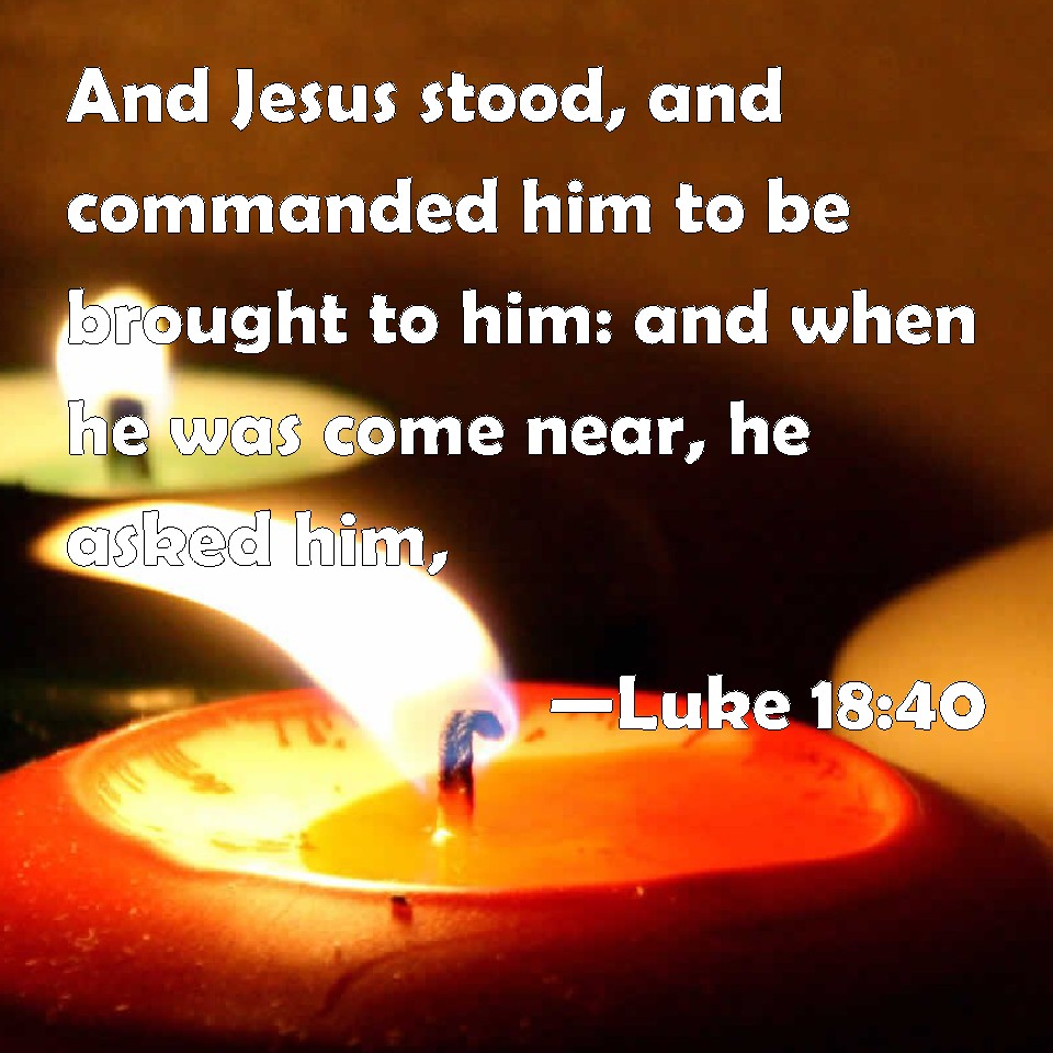 Choose a Background Luke 18:40 And Jesus stood, and commanded him to be brought to him: and when he was come near, he asked him, KJV: And Jesus stood, and commanded him to be brought unto him: and when he was come near, he asked him, DRB: And Jesus standing, commanded him to be brought unto him. And when he was come near, he asked him, DBT: And Jesus stood still, and commanded him to be led to him. And when he drew nigh he asked him saying, ERV: And Jesus stood, and commanded him to be brought unto him: and when he was come near, he asked him, WBT: And Jesus stood and commanded him to be brought to him: and when he had come near, he asked him, WEB: Standing still, Jesus commanded him to be brought to him. When he had come near, he asked him, YLT: And Jesus having stood, commanded him to be brought unto him, and he having come nigh, he questioned him,Links Luke 18:40 NIV • Luke 18:40 NLT • Luke 18:40 ESV • Luke 18:40 NASB • Luke 18:40 KJV • Luke 18:40 Interlinear • Luke 18:40 Commentaries • Luke 18:40 Parallel Texts • Luke 18:40 Bible Apps • Luke 18:40 Parallel • Bible Hub |