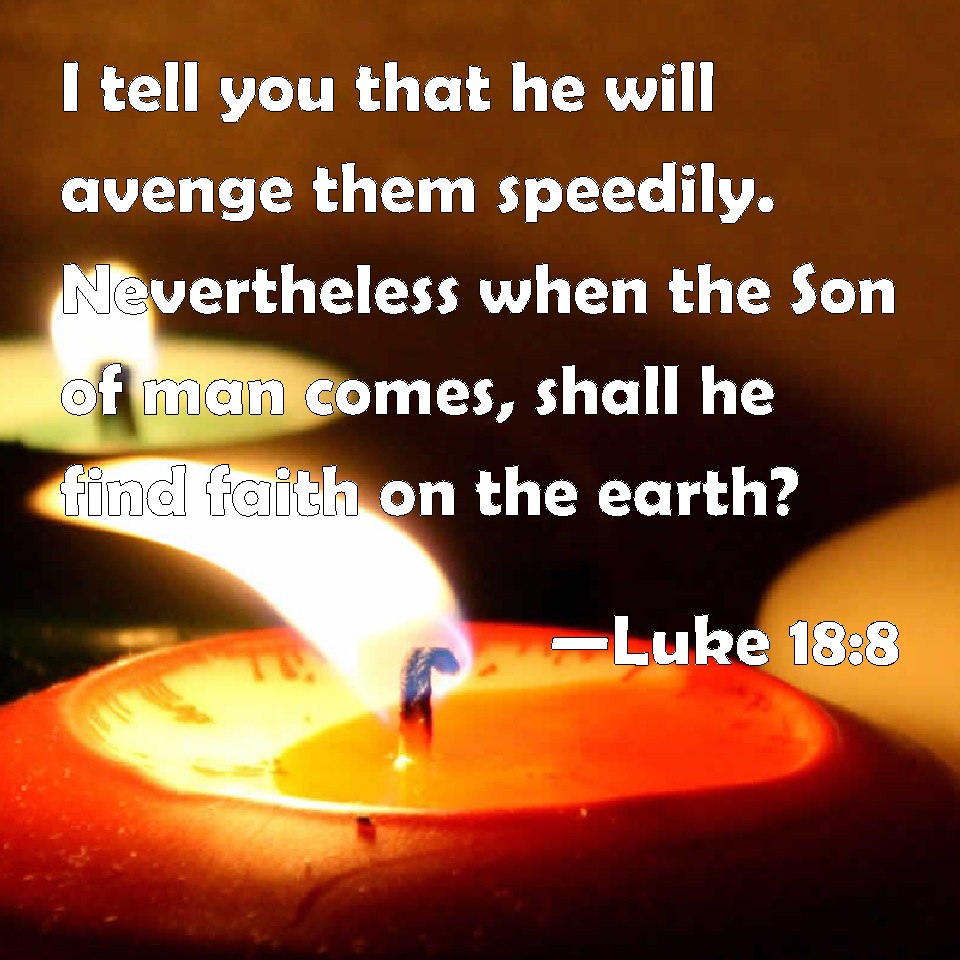 Choose a Background Luke 18:8 I tell you that he will avenge them speedily. Nevertheless when the Son of man comes, shall he find faith on the earth? KJV: I tell you that he will avenge them speedily. Nevertheless when the Son of man cometh, shall he find faith on the earth? DRB: I say to you, that he will quickly revenge them. But yet the Son of man, when he cometh, shall he find, think you, faith on earth? DBT: I say unto you that he will avenge them speedily. But when the Son of man comes, shall he indeed find faith on the earth? ERV: I say unto you, that he will avenge them speedily. Howbeit when the Son of man cometh, shall he find faith on the earth? WBT: I tell you that he will avenge them speedily. Nevertheless, when the Son of man cometh, will he find faith on the earth? WEB: I tell you that he will avenge them quickly. Nevertheless, when the Son of Man comes, will he find faith on the earth?" YLT: I say to you, that He will execute the justice to them quickly; but the Son of Man having come, shall he find the faith upon the earth?'Links Luke 18:8 NIV • Luke 18:8 NLT • Luke 18:8 ESV • Luke 18:8 NASB • Luke 18:8 KJV • Luke 18:8 Interlinear • Luke 18:8 Commentaries • Luke 18:8 Parallel Texts • Luke 18:8 Bible Apps • Luke 18:8 Parallel • Bible Hub |