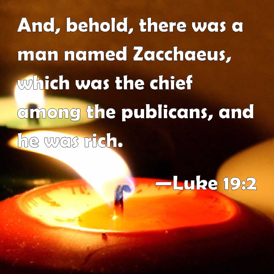 Choose a Background Luke 19:2 And, behold, there was a man named Zacchaeus, which was the chief among the publicans, and he was rich. KJV: And, behold, there was a man named Zacchaeus, which was the chief among the publicans, and he was rich. DRB: And behold, there was a man named Zacheus, who was the chief of the publicans, and he was rich. DBT: And behold, there was a man by name called Zacchaeus, and he was chief tax-gatherer, and he was rich. ERV: And behold, a man called by name Zacchaeus; and he was a chief publican, and he was rich. WBT: And behold, there was a man named Zaccheus, who was the chief among the publicans, and he was rich. WEB: There was a man named Zacchaeus. He was a chief tax collector, and he was rich. YLT: and lo, a man, by name called Zaccheus, and he was a chief tax-gatherer, and he was rich,Links Luke 19:2 NIV • Luke 19:2 NLT • Luke 19:2 ESV • Luke 19:2 NASB • Luke 19:2 KJV • Luke 19:2 Interlinear • Luke 19:2 Commentaries • Luke 19:2 Parallel Texts • Luke 19:2 Bible Apps • Luke 19:2 Parallel • Bible Hub |