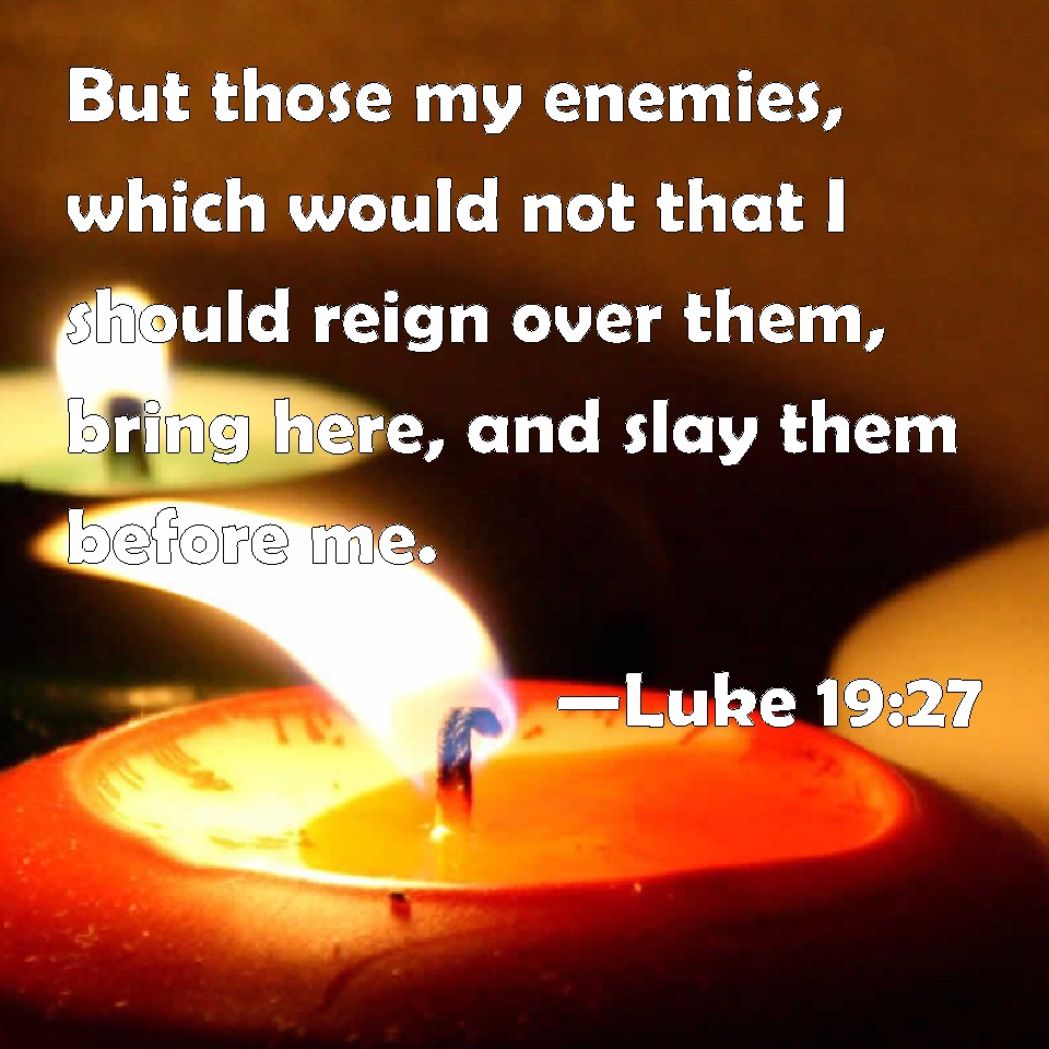 Choose a Background Luke 19:27 But those my enemies, which would not that I should reign over them, bring here, and slay them before me. KJV: But those mine enemies, which would not that I should reign over them, bring hither, and slay them before me. DRB: But as for those my enemies, who would not have me reign over them, bring them hither, and kill them before me. DBT: Moreover those mine enemies, who would not have me to reign over them, bring them here and slay them before me. ERV: Howbeit these mine enemies, which would not that I should reign over them, bring hither, and slay them before me. WBT: But those my enemies, who would not that I should reign over them, bring hither, and slay them before me. WEB: But bring those enemies of mine who didn't want me to reign over them here, and kill them before me.'" YLT: but those my enemies, who did not wish me to reign over them, bring hither and slay before me.'Links Luke 19:27 NIV • Luke 19:27 NLT • Luke 19:27 ESV • Luke 19:27 NASB • Luke 19:27 KJV • Luke 19:27 Interlinear • Luke 19:27 Commentaries • Luke 19:27 Parallel Texts • Luke 19:27 Bible Apps • Luke 19:27 Parallel • Bible Hub |
