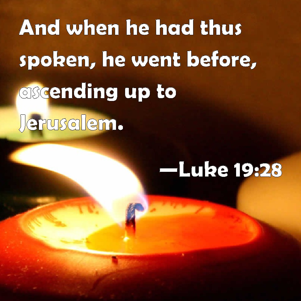 Choose a Background Luke 19:28 And when he had thus spoken, he went before, ascending up to Jerusalem. KJV: And when he had thus spoken, he went before, ascending up to Jerusalem. DRB: And having said these things, he went before, going up to Jerusalem. DBT: And having said these things, he went on before, going up to Jerusalem. ERV: And when he had thus spoken, he went on before, going up to Jerusalem. WBT: And when he had thus spoken, he went before, ascending towards Jerusalem. WEB: Having said these things, he went on ahead, going up to Jerusalem. YLT: And having said these things, he went on before, going up to Jerusalem.Links Luke 19:28 NIV • Luke 19:28 NLT • Luke 19:28 ESV • Luke 19:28 NASB • Luke 19:28 KJV • Luke 19:28 Interlinear • Luke 19:28 Commentaries • Luke 19:28 Parallel Texts • Luke 19:28 Bible Apps • Luke 19:28 Parallel • Bible Hub |