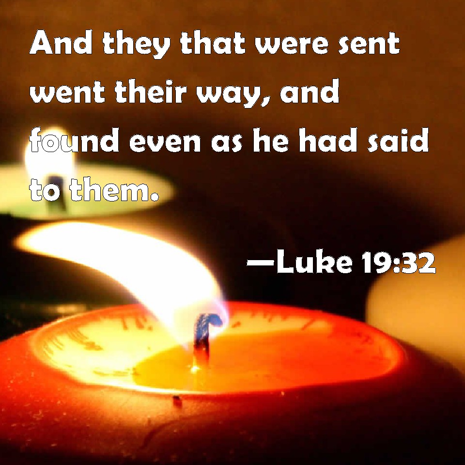 Choose a Background Luke 19:32 And they that were sent went their way, and found even as he had said to them. KJV: And they that were sent went their way, and found even as he had said unto them. DRB: And they that were sent, went their way, and found the colt standing, as he had said unto them. DBT: And they that were sent, having gone their way, found as he had said to them. ERV: And they that were sent went away, and found even as he had said unto them. WBT: And they that were sent, went and found even as he had said to them. WEB: Those who were sent went away, and found things just as he had told them. YLT: And those sent, having gone away, found according as he said to them,Links Luke 19:32 NIV • Luke 19:32 NLT • Luke 19:32 ESV • Luke 19:32 NASB • Luke 19:32 KJV • Luke 19:32 Interlinear • Luke 19:32 Commentaries • Luke 19:32 Parallel Texts • Luke 19:32 Bible Apps • Luke 19:32 Parallel • Bible Hub |