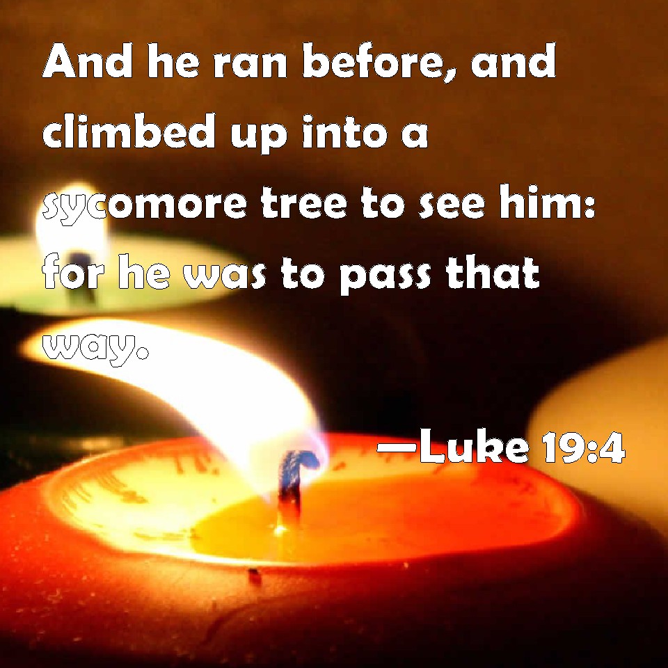 Choose a Background Luke 19:4 And he ran before, and climbed up into a sycomore tree to see him: for he was to pass that way. KJV: And he ran before, and climbed up into a sycomore tree to see him: for he was to pass that way. DRB: And running before, he climbed up into a sycamore tree, that he might see him; for he was to pass that way. DBT: And running on before, he got up into a sycamore that he might see him, for he was going to pass that way. ERV: And he ran on before, and climbed up into a sycomore tree to see him: for he was to pass that way. WBT: And he ran before, and climbed up upon a sycamore-tree to see him; for he was to pass that way. WEB: He ran on ahead, and climbed up into a sycamore tree to see him, for he was to pass that way. YLT: and having run forward before, he went up on a sycamore, that he may see him, because through that way he was about to pass by.Links Luke 19:4 NIV • Luke 19:4 NLT • Luke 19:4 ESV • Luke 19:4 NASB • Luke 19:4 KJV • Luke 19:4 Interlinear • Luke 19:4 Commentaries • Luke 19:4 Parallel Texts • Luke 19:4 Bible Apps • Luke 19:4 Parallel • Bible Hub |