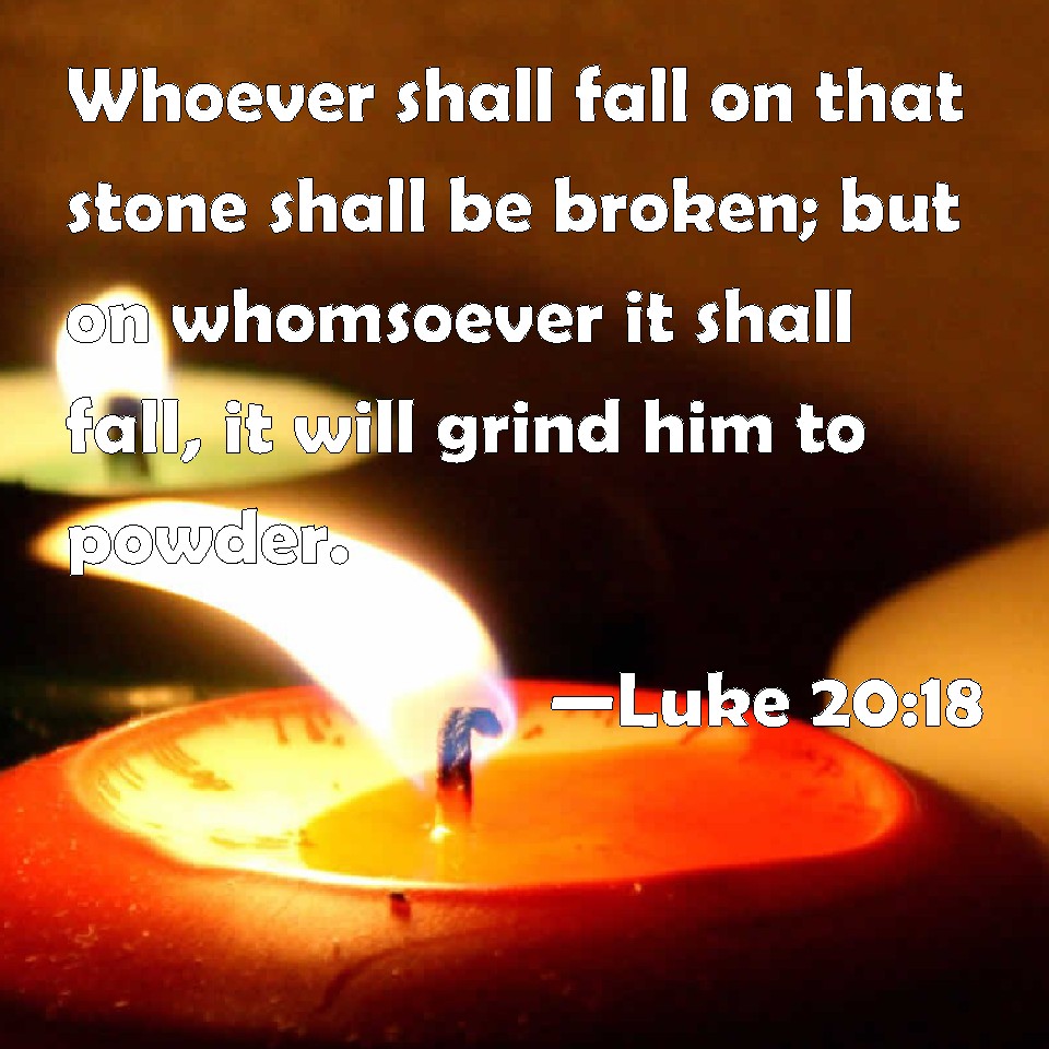 Choose a Background Luke 20:18 Whoever shall fall on that stone shall be broken; but on whomsoever it shall fall, it will grind him to powder. KJV: Whosoever shall fall upon that stone shall be broken; but on whomsoever it shall fall, it will grind him to powder. DRB: Whosoever shall fall upon that stone, shall be bruised: and upon whomsoever it shall fall, it will grind him to powder. DBT: Every one falling on this stone shall be broken, but on whomsoever it shall fall, it shall grind him to powder. ERV: Every one that falleth on that stone shall be broken to pieces; but on whomsoever it shall fall, it will scatter him as dust. WBT: Whoever shall fall upon that stone, shall be broken: but on whomsoever it shall fall, it will grind him to powder. WEB: Everyone who falls on that stone will be broken to pieces, but it will crush whomever it falls on to dust." YLT: every one who hath fallen on that stone shall be broken, and on whom it may fall, it will crush him to pieces.'Links Luke 20:18 NIV • Luke 20:18 NLT • Luke 20:18 ESV • Luke 20:18 NASB • Luke 20:18 KJV • Luke 20:18 Interlinear • Luke 20:18 Commentaries • Luke 20:18 Parallel Texts • Luke 20:18 Bible Apps • Luke 20:18 Parallel • Bible Hub |