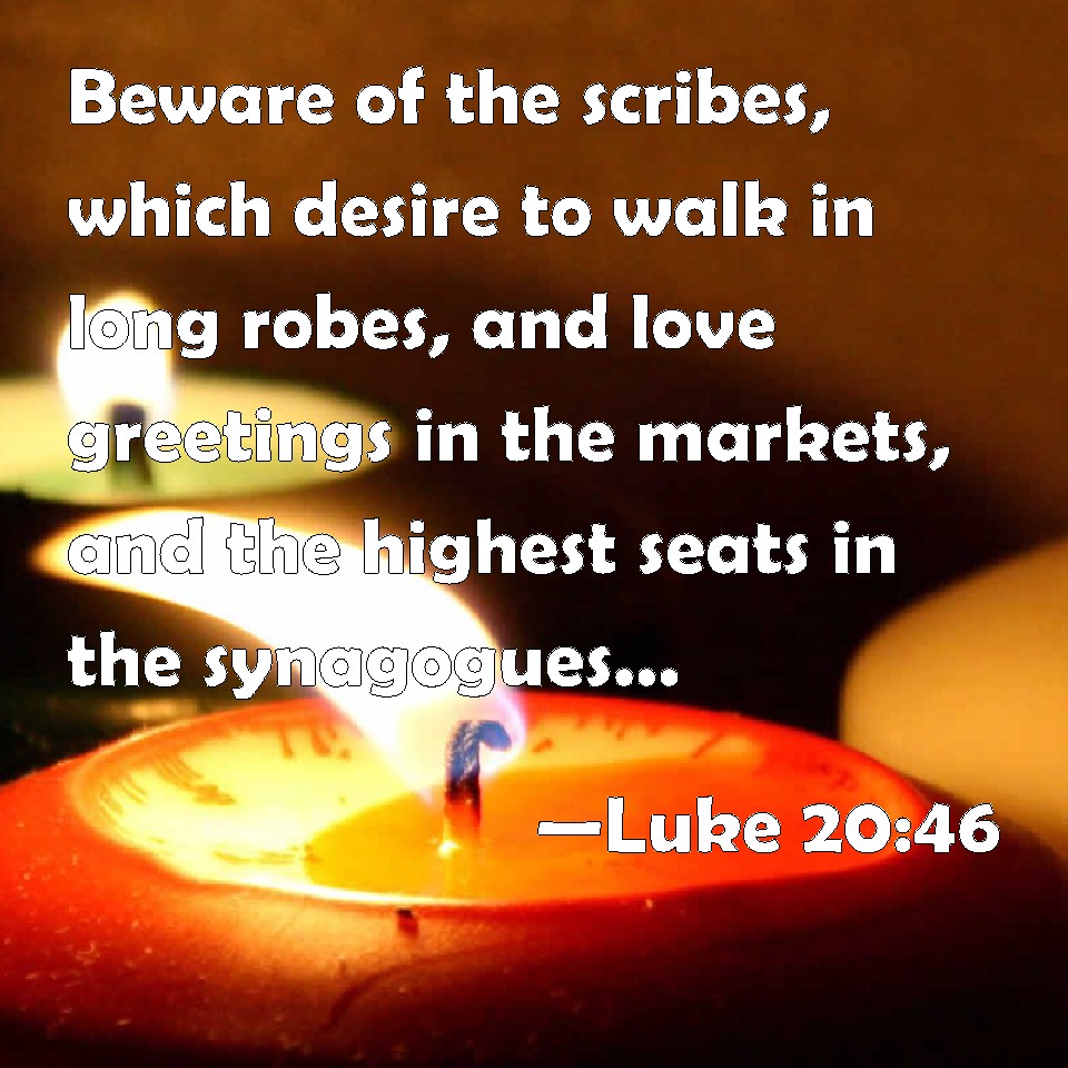 Choose a Background Luke 20:46 Beware of the scribes, which desire to walk in long robes, and love greetings in the markets, and the highest seats in the synagogues, and the chief rooms at feasts; KJV: Beware of the scribes, which desire to walk in long robes, and love greetings in the markets, and the highest seats in the synagogues, and the chief rooms at feasts; DRB: Beware of the scribes, who desire to walk in long robes, and love salutations in the marketplace, and the first chairs in the synagogues, and the chief rooms at feasts: DBT: Beware of the scribes, who like to walk about in long robes, and who love salutations in the market-places, and first seats in the synagogues, and first places at suppers; ERV: Beware of the scribes, which desire to walk in long robes, and love salutations in the marketplaces, and chief seats in the synagogues, and chief places at feasts; WBT: Beware of the scribes, who desire to walk in long robes, and love greetings in the markets, and the highest seats in the synagogues, and the chief rooms at feasts; WEB: "Beware of the scribes, who like to walk in long robes, and love greetings in the marketplaces, the best seats in the synagogues, and the best places at feasts; YLT: 'Take heed of the scribes, who are wishing to walk in long robes, and are loving salutations in the markets, and first seats in the synagogues, and first couches in the suppers,Links Luke 20:46 NIV • Luke 20:46 NLT • Luke 20:46 ESV • Luke 20:46 NASB • Luke 20:46 KJV • Luke 20:46 Interlinear • Luke 20:46 Commentaries • Luke 20:46 Parallel Texts • Luke 20:46 Bible Apps • Luke 20:46 Parallel • Bible Hub |