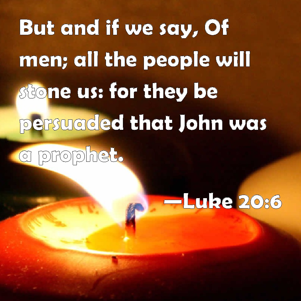 Choose a Background Luke 20:6 But and if we say, Of men; all the people will stone us: for they be persuaded that John was a prophet. KJV: But and if we say, Of men; all the people will stone us: for they be persuaded that John was a prophet. DRB: But if we say, Of men, the whole people will stone us: for they are persuaded that John was a prophet. DBT: but if we should say, Of men, the whole people will stone us, for they are persuaded that John was a prophet. ERV: But if we shall say, From men; all the people will stone us: for they be persuaded that John was a prophet. WBT: But if we say, From men; all the people will stone us: for they are persuaded that John was a prophet. WEB: But if we say, 'From men,' all the people will stone us, for they are persuaded that John was a prophet." YLT: and if we may say, From men, all the people will stone us, for they are having been persuaded John to be a prophet.'Links Luke 20:6 NIV • Luke 20:6 NLT • Luke 20:6 ESV • Luke 20:6 NASB • Luke 20:6 KJV • Luke 20:6 Interlinear • Luke 20:6 Commentaries • Luke 20:6 Parallel Texts • Luke 20:6 Bible Apps • Luke 20:6 Parallel • Bible Hub |