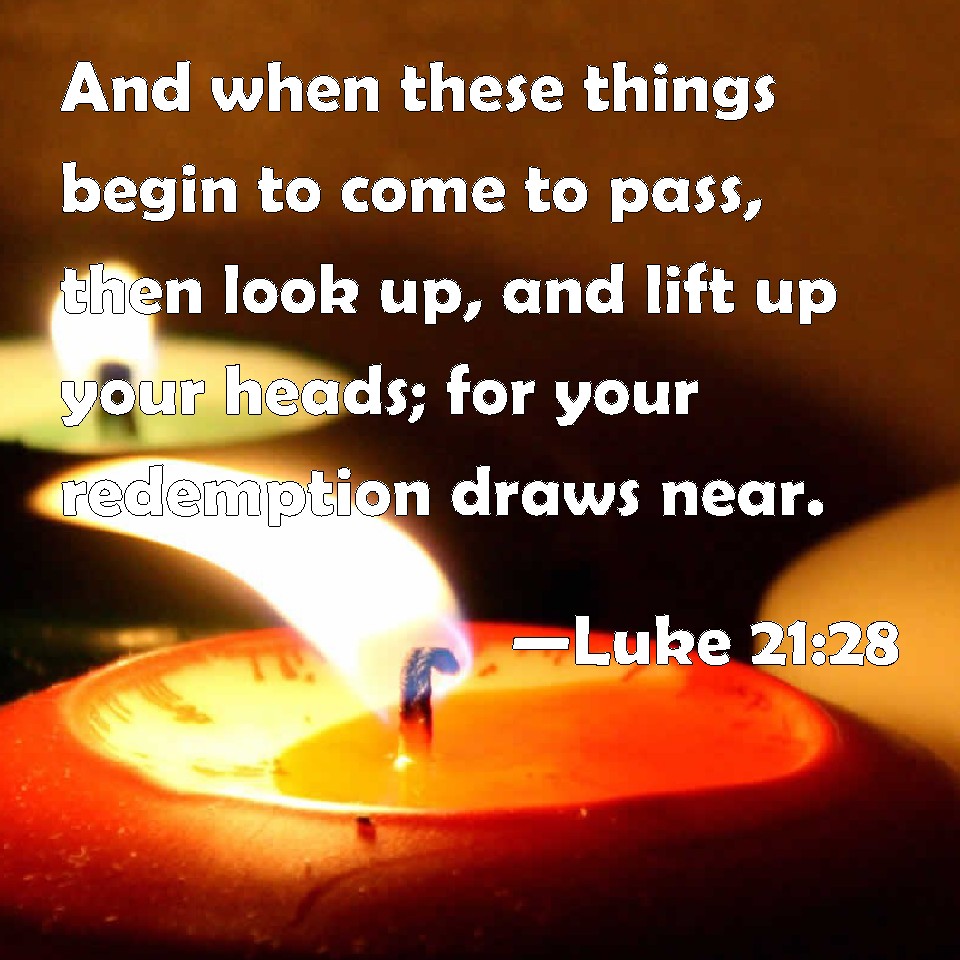 Choose a Background Luke 21:28 And when these things begin to come to pass, then look up, and lift up your heads; for your redemption draws near. KJV: And when these things begin to come to pass, then look up, and lift up your heads; for your redemption draweth nigh. DRB: But when these things begin to come to pass, look up, and lift up your heads, because your redemption is at hand. DBT: But when these things begin to come to pass, look up and lift up your heads, because your redemption draws nigh. ERV: But when these things begin to come to pass, look up, and lift up your heads; because your redemption draweth nigh. WBT: And when these things begin to come to pass, then look up, and lift up your heads: for your redemption draweth nigh. WEB: But when these things begin to happen, look up, and lift up your heads, because your redemption is near." YLT: and these things beginning to happen bend yourselves back, and lift up your heads, because your redemption doth draw nigh.'Links Luke 21:28 NIV • Luke 21:28 NLT • Luke 21:28 ESV • Luke 21:28 NASB • Luke 21:28 KJV • Luke 21:28 Interlinear • Luke 21:28 Commentaries • Luke 21:28 Parallel Texts • Luke 21:28 Bible Apps • Luke 21:28 Parallel • Bible Hub |