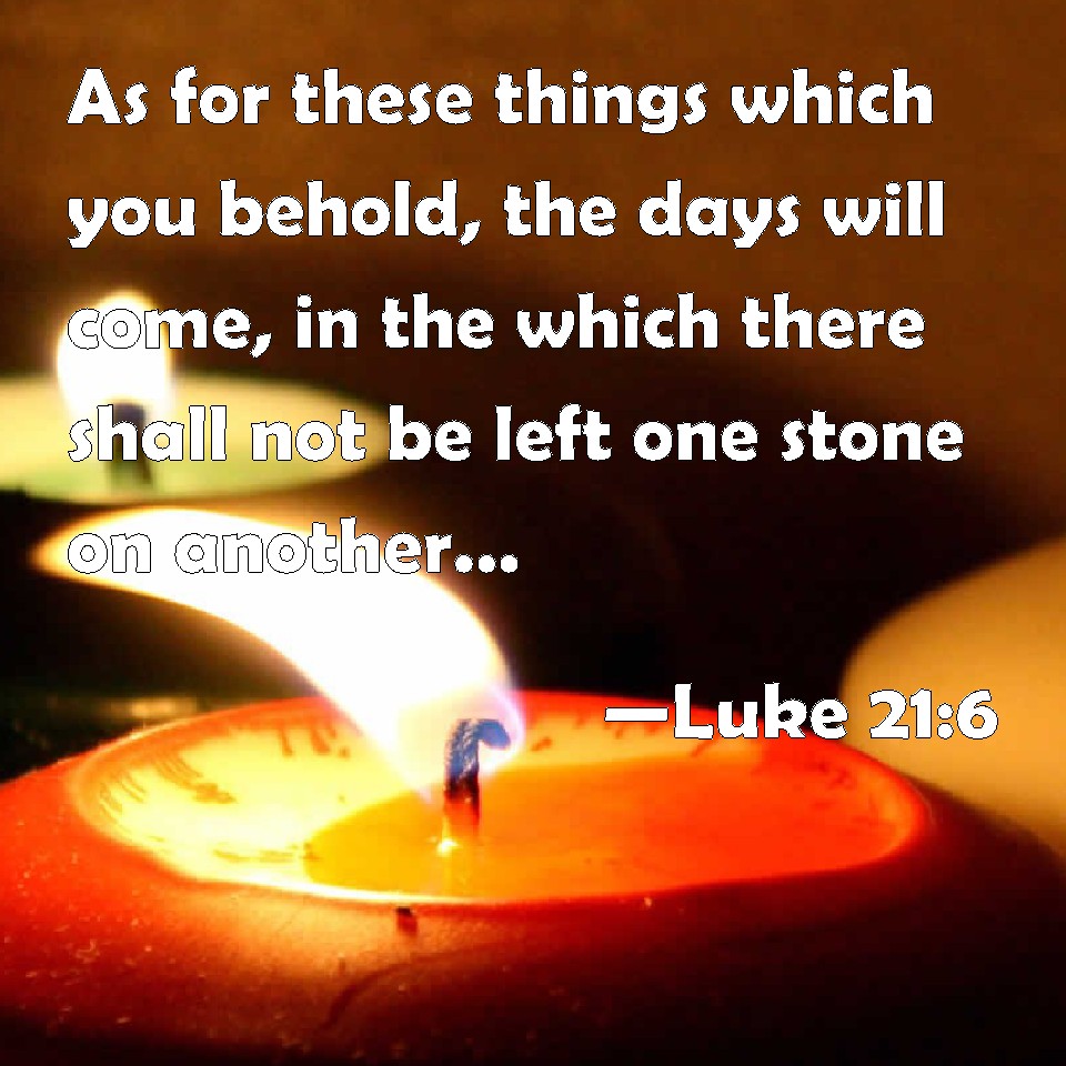 Choose a Background Luke 21:6 As for these things which you behold, the days will come, in the which there shall not be left one stone on another, that shall not be thrown down. KJV: As for these things which ye behold, the days will come, in the which there shall not be left one stone upon another, that shall not be thrown down. DRB: These things which you see, the days will come in which there shall not be left a stone upon a stone that shall not be thrown down. DBT: As to these things which ye are beholding, days are coming in which there shall not be left stone upon stone which shall not be thrown down. ERV: As for these things which ye behold, the days will come, in which there shall not be left here one stone upon another, that shall not be thrown down. WBT: As for these things which ye behold, the days will come, in which there shall not be left one stone upon another, that will not be thrown down. WEB: "As for these things which you see, the days will come, in which there will not be left here one stone on another that will not be thrown down." YLT: These things that ye behold — days will come, in which there shall not be left a stone upon a stone, that shall not be thrown down.'Links Luke 21:6 NIV • Luke 21:6 NLT • Luke 21:6 ESV • Luke 21:6 NASB • Luke 21:6 KJV • Luke 21:6 Interlinear • Luke 21:6 Commentaries • Luke 21:6 Parallel Texts • Luke 21:6 Bible Apps • Luke 21:6 Parallel • Bible Hub |